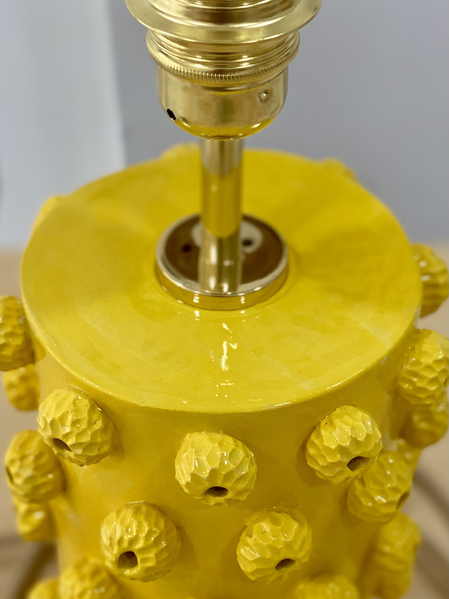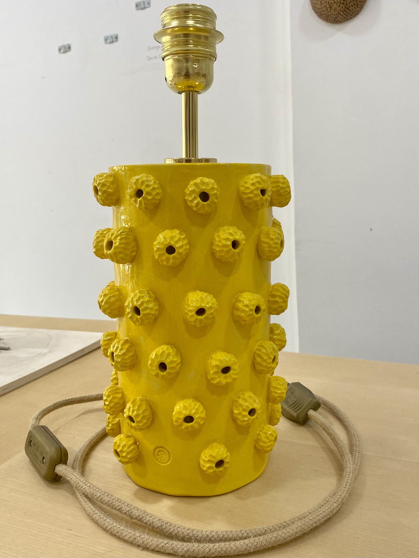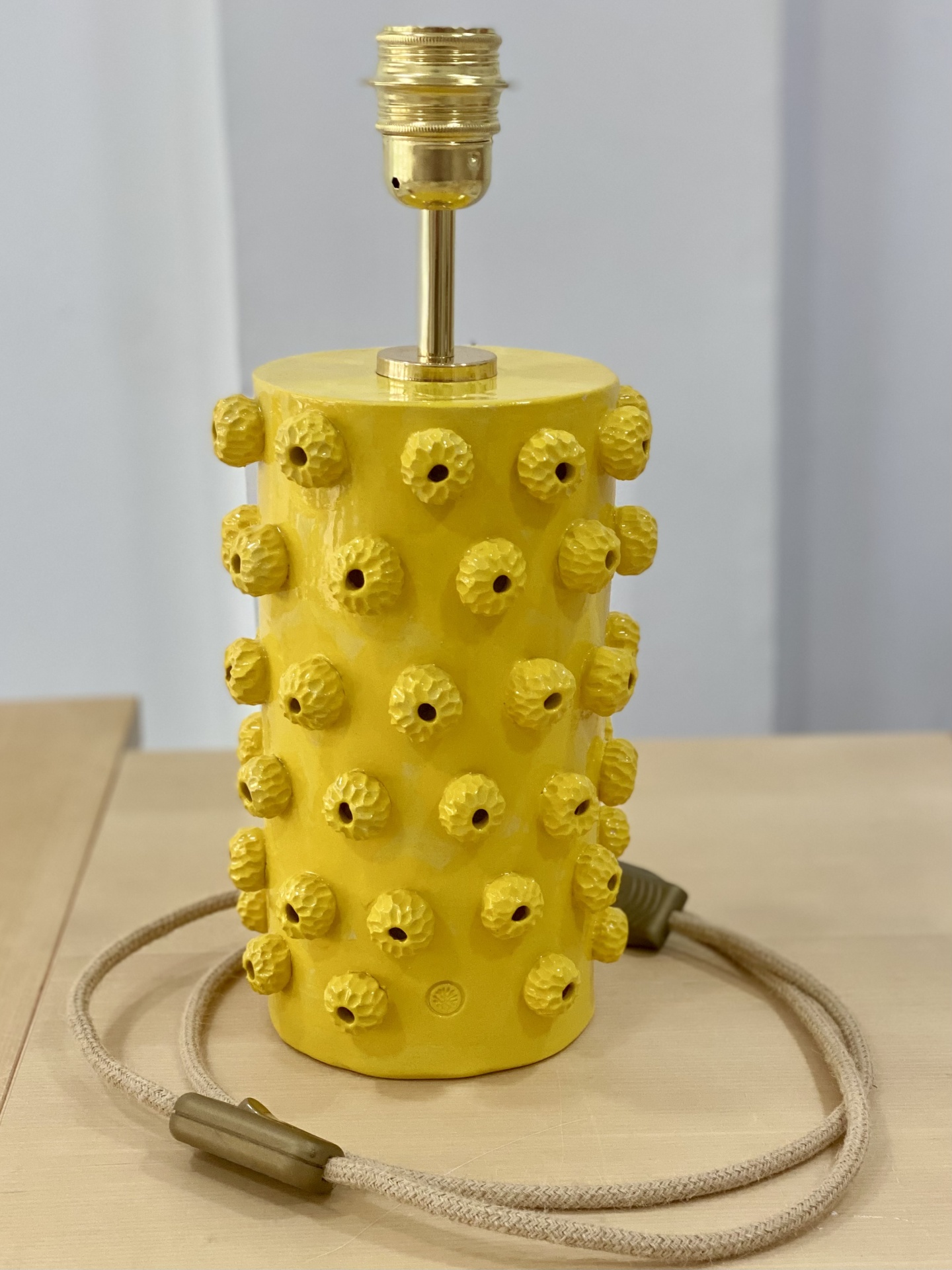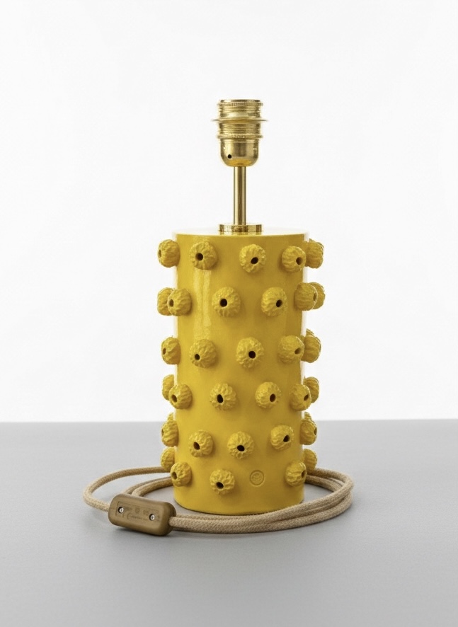 • Candeeiro de mesa amarelo em cerâmica com textura de protuberâncias redondas e cabo bege