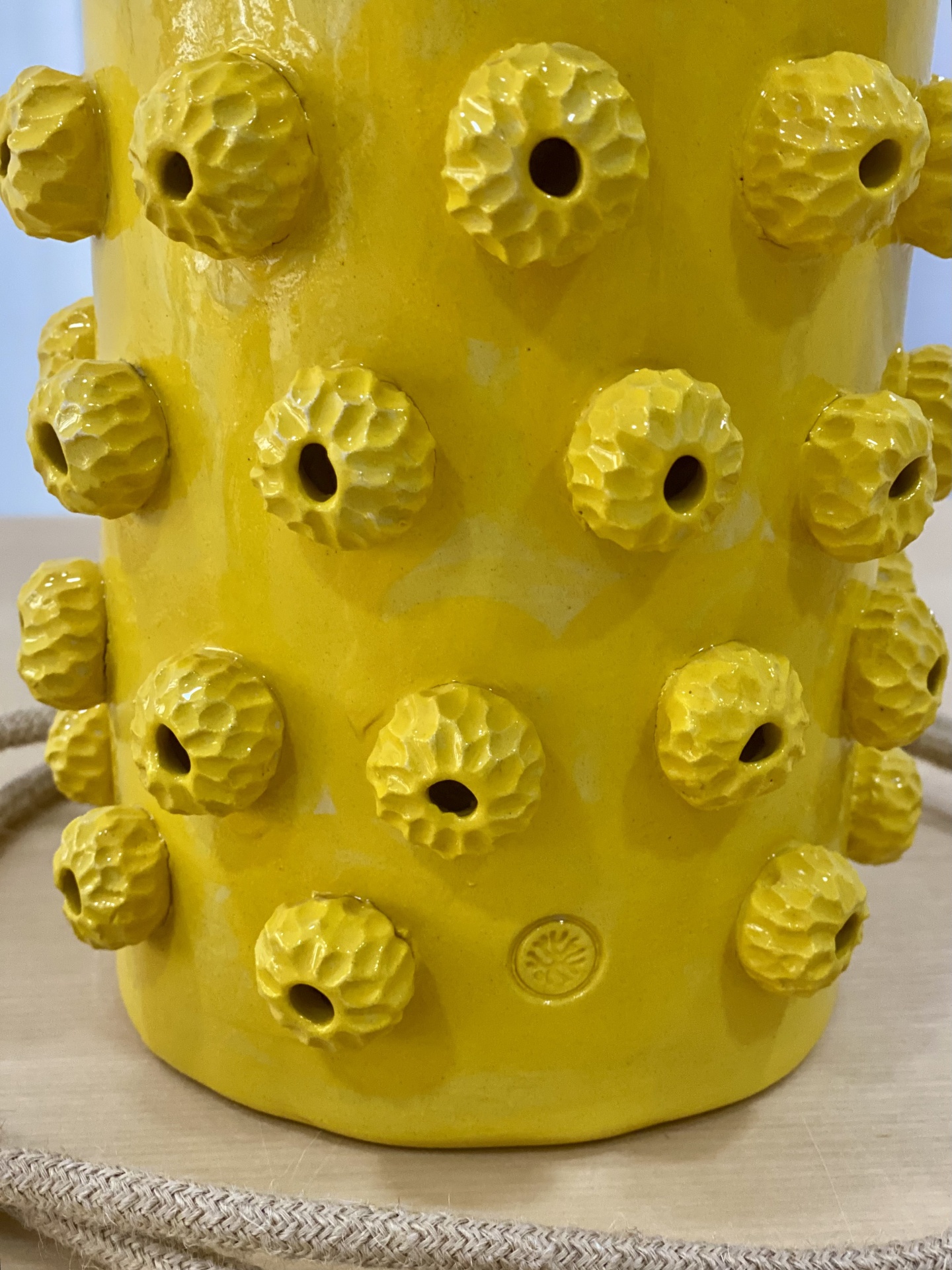• Vaso cerâmico amarelo com textura de botões redondos salientes.