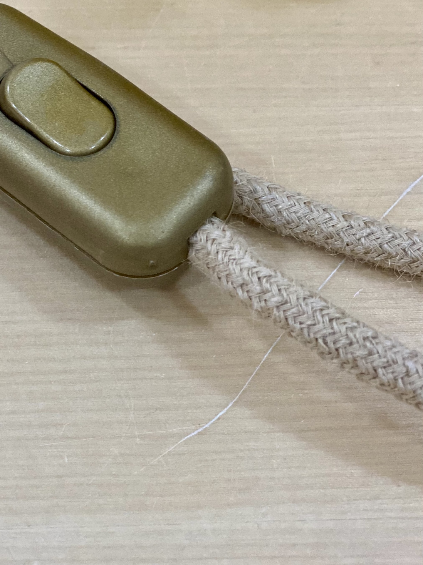 • Interruptor castanho com cabo trançado bege sobre madeira clara