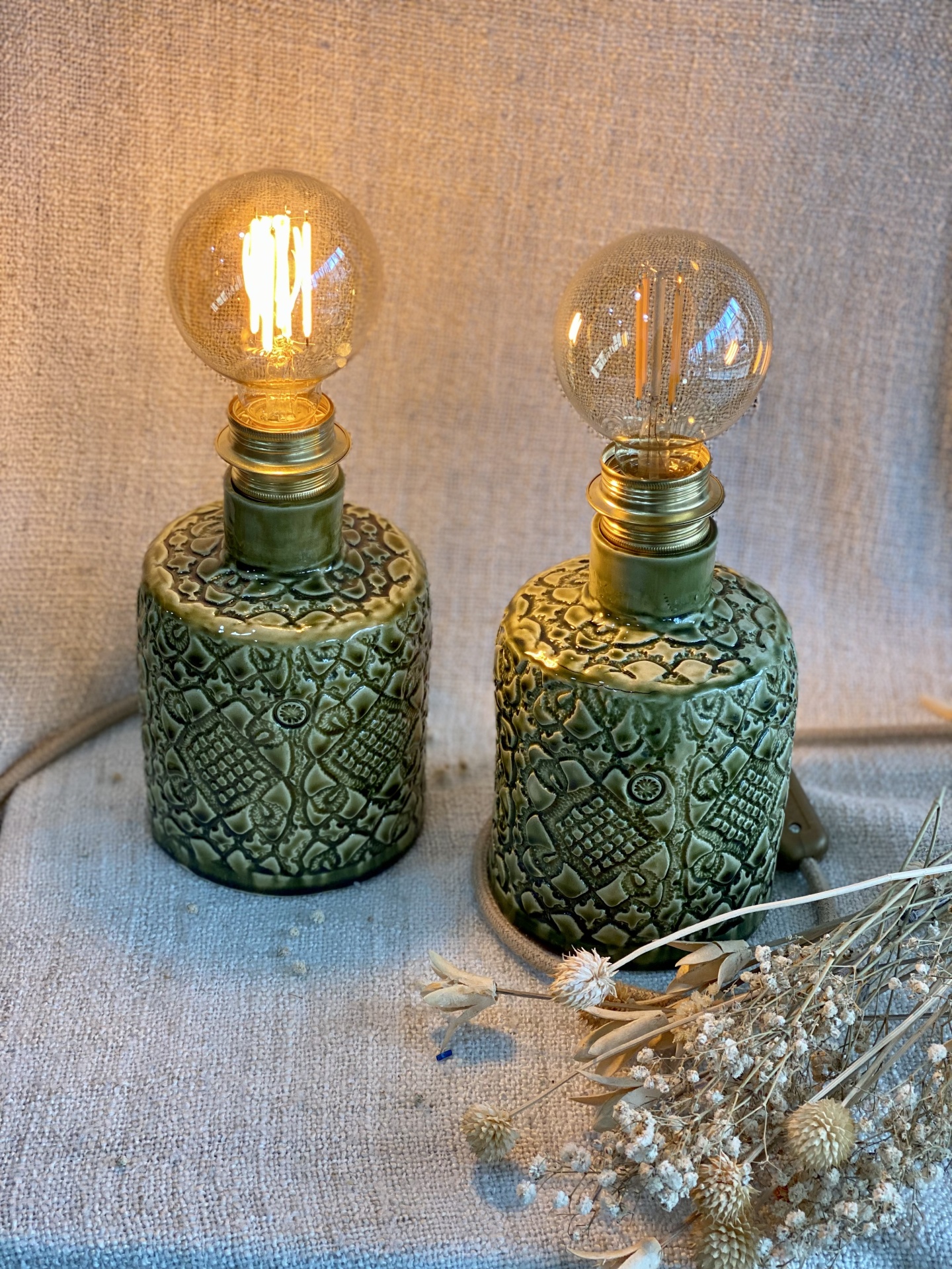 • Dois candeeiros pequenos de cerâmica verde com lâmpadas redondas acesas e flores secas sobre tecido bege