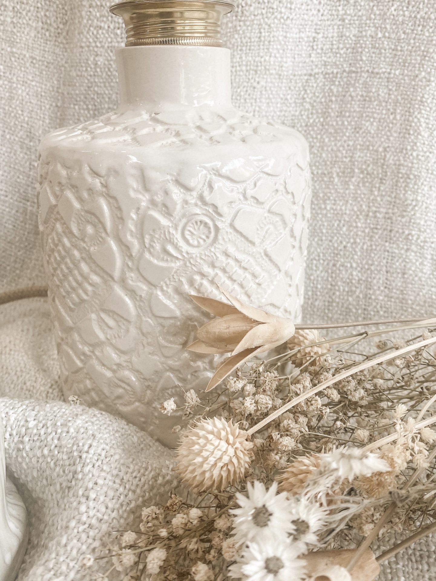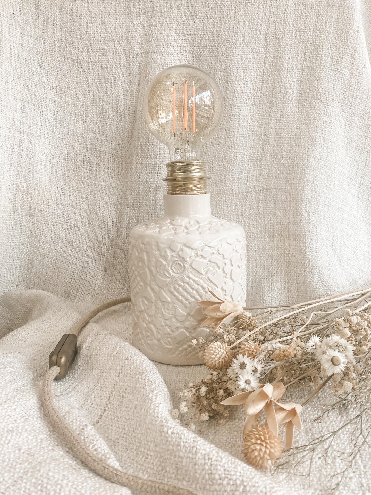Lâmpada decorativa com base branca texturizada e flores secas sobre fundo bege