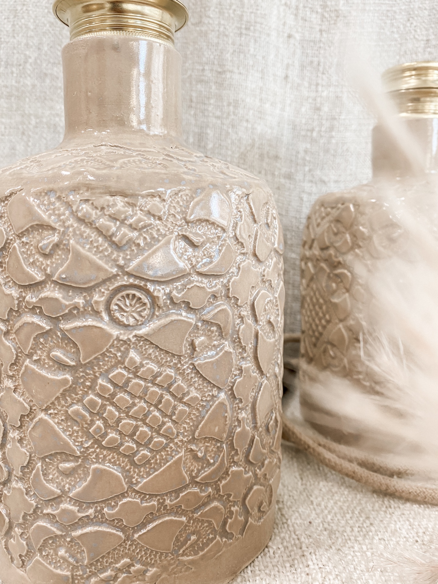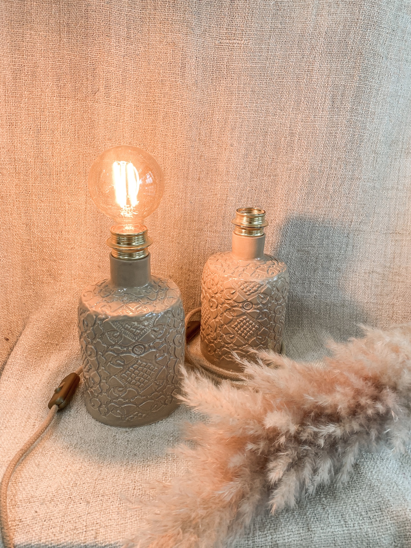 • Duas lâmpadas de mesa em cerâmica cinza com padrão, uma acesa, sobre tecido bege com planta decorativa