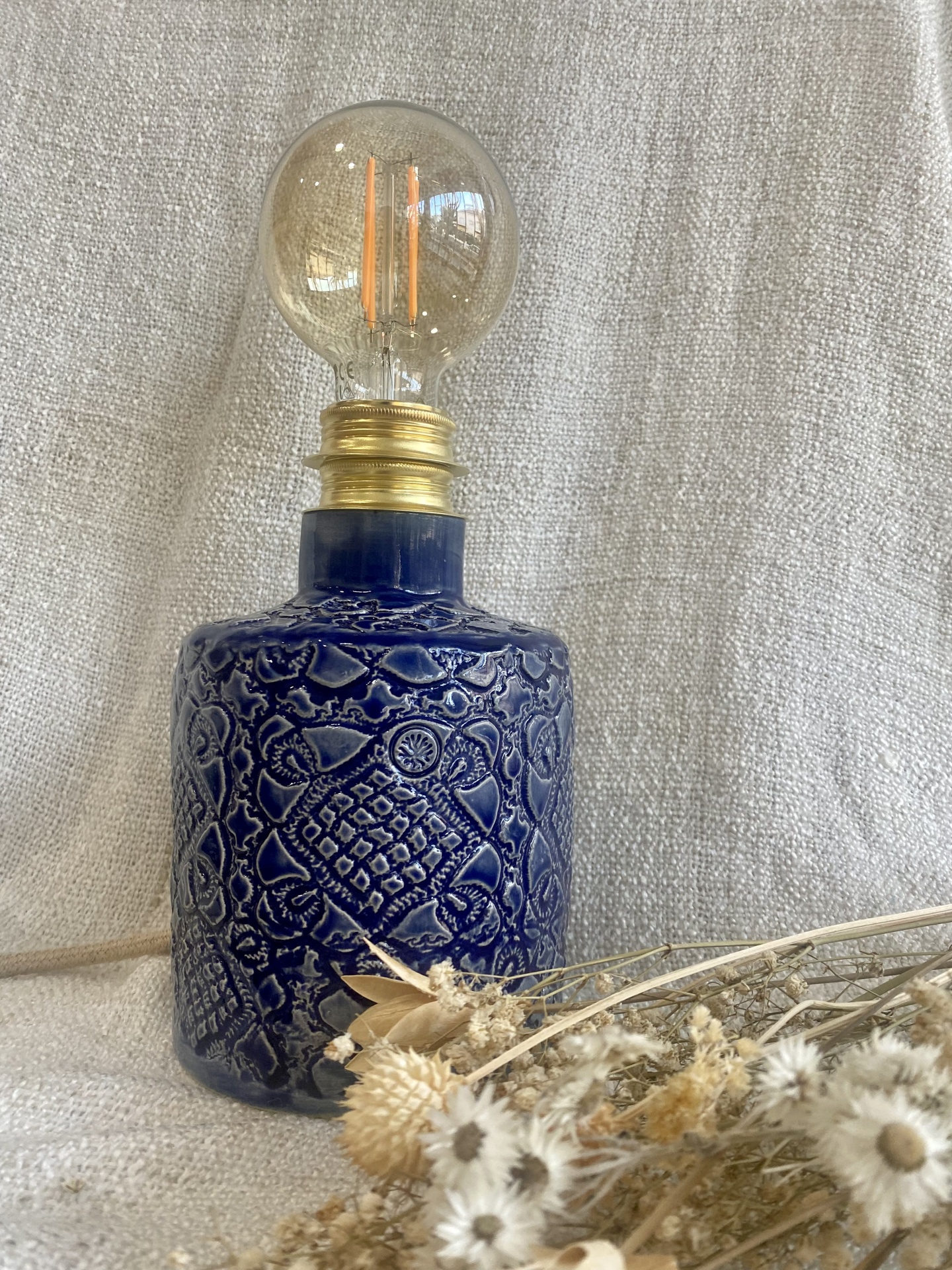 • Candeeiro de mesa cerâmico azul com lâmpada de filamentos e flores secas
