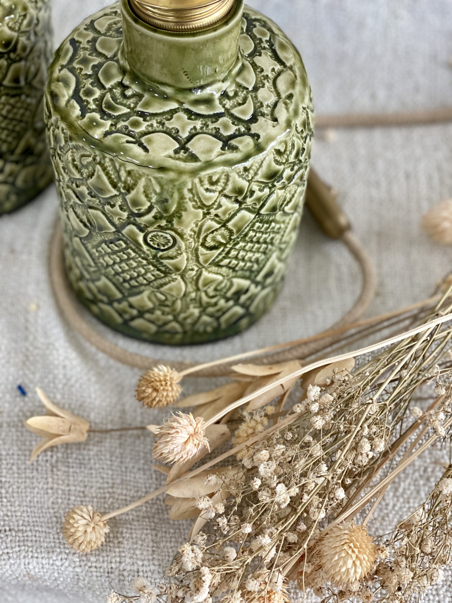 • Frasco cerâmico verde com padrão e flores secas sobre tecido
