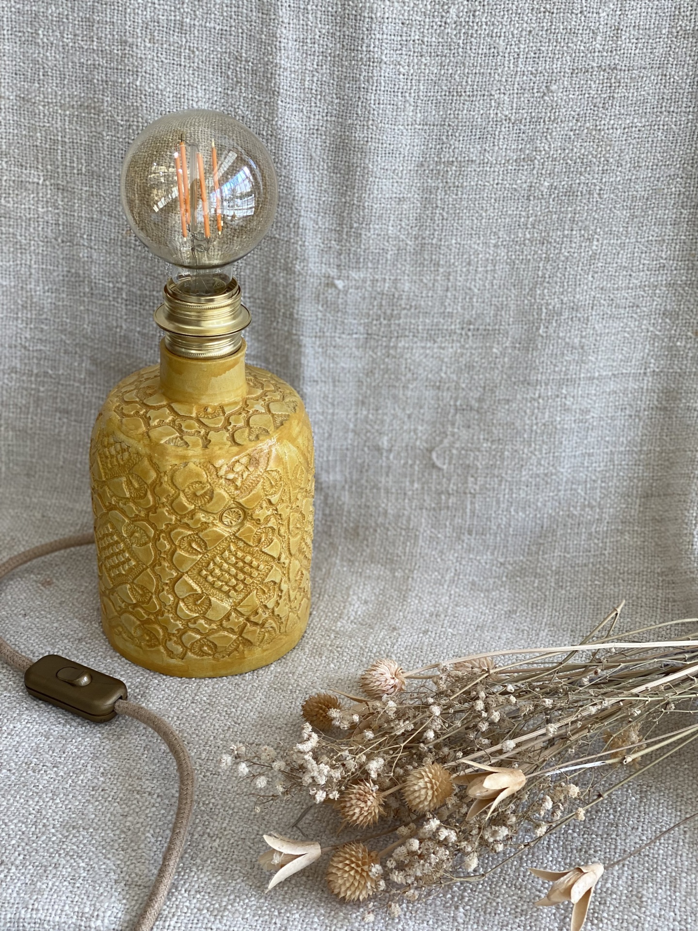 • Abajur com base em vidro amarelo texturizado e lâmpada de filamento, com ramo de flores secas ao lado