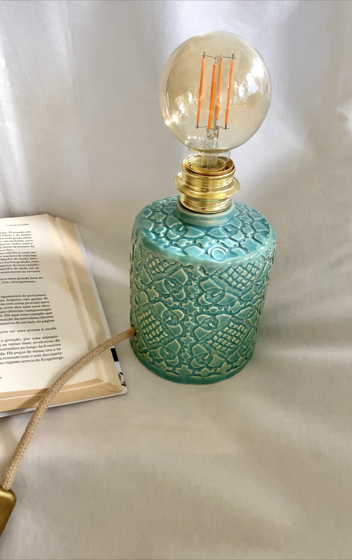 • Lâmpada com base azul turquesa texturizada e bulbo grande ao lado de livro aberto