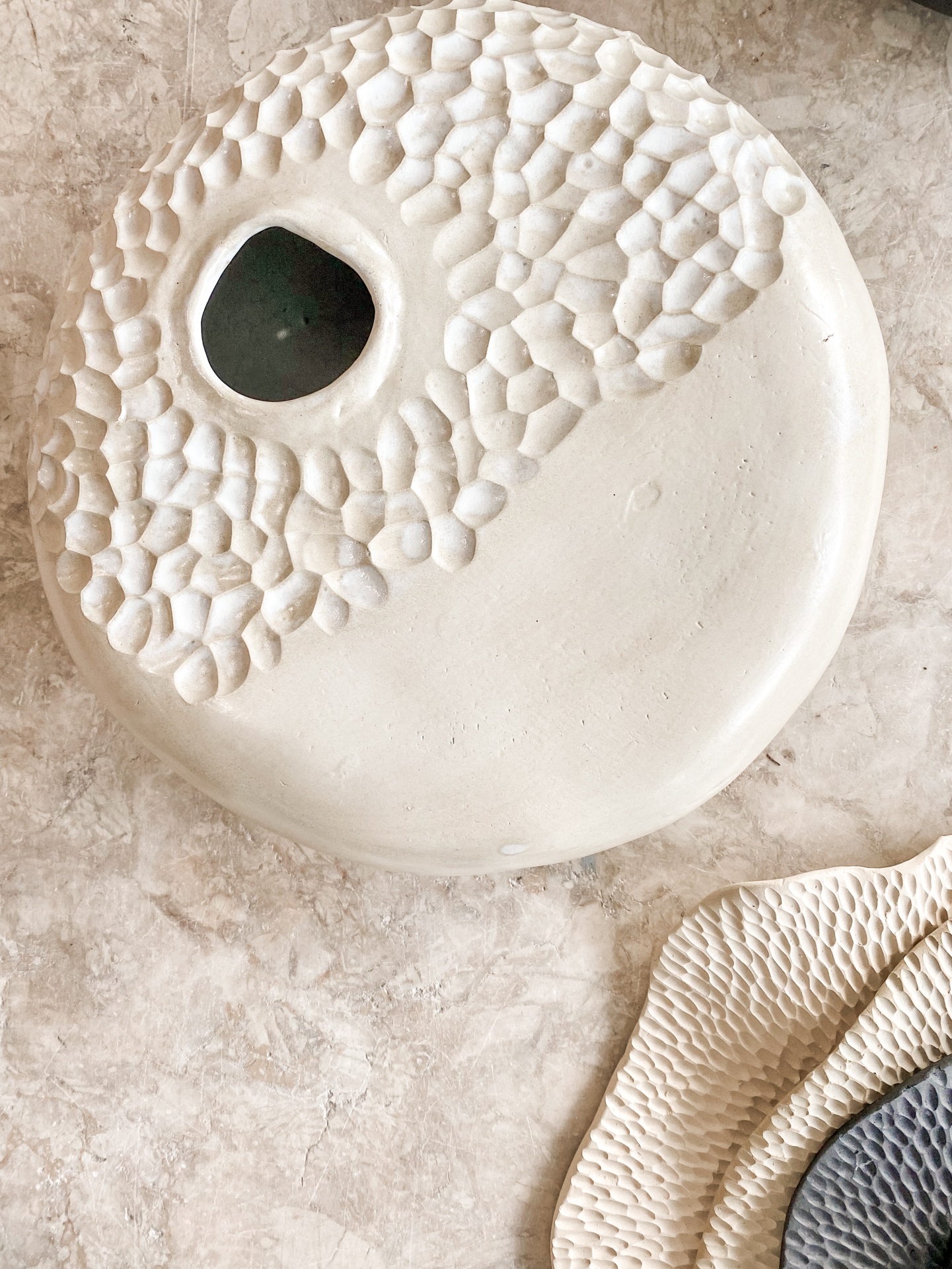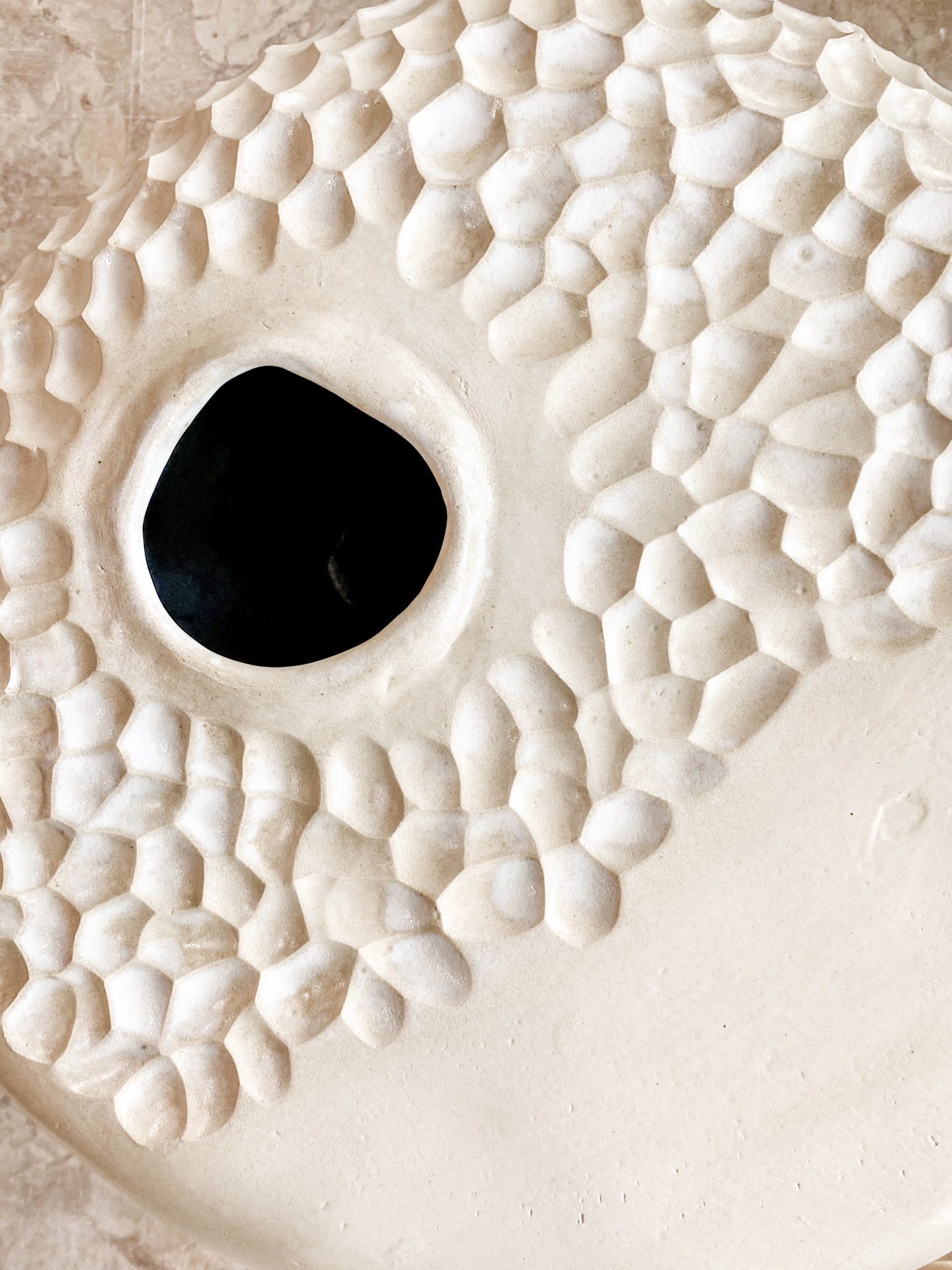 • Vaso de cerâmica branca com textura de escamas e abertura oval no centro