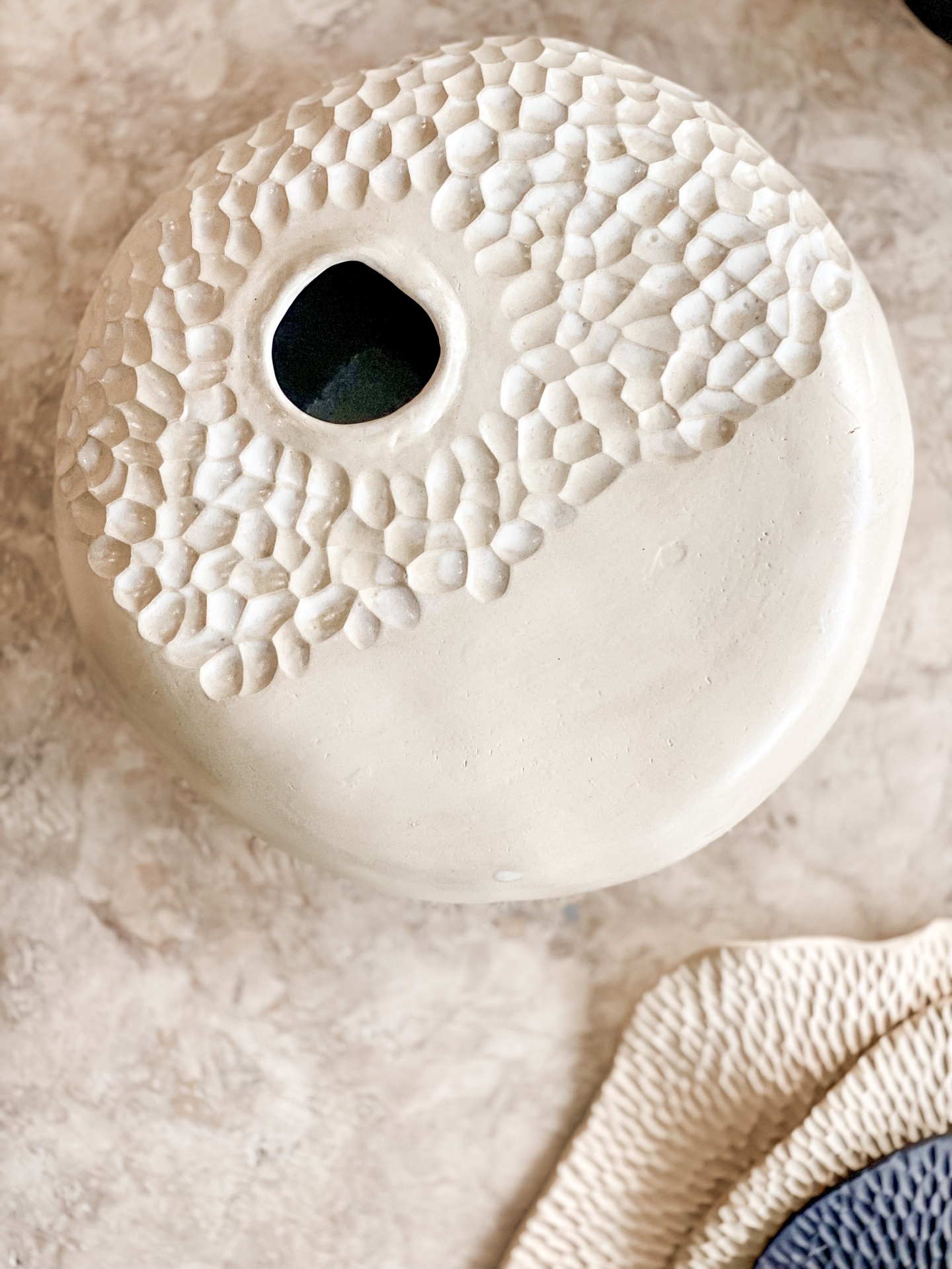 • Vaso decorativo branco texturizado com abertura redonda sobre superfície de mármore
