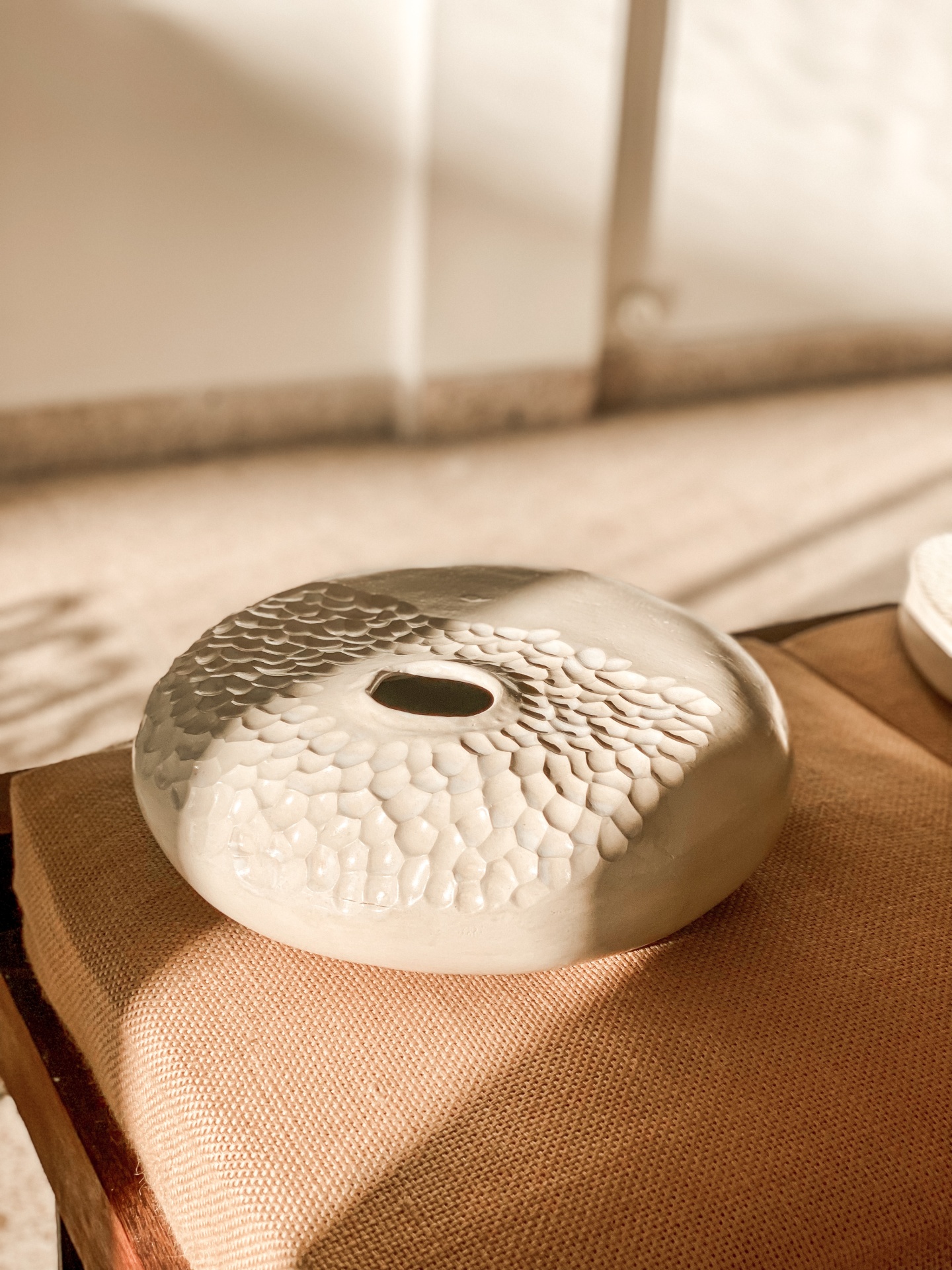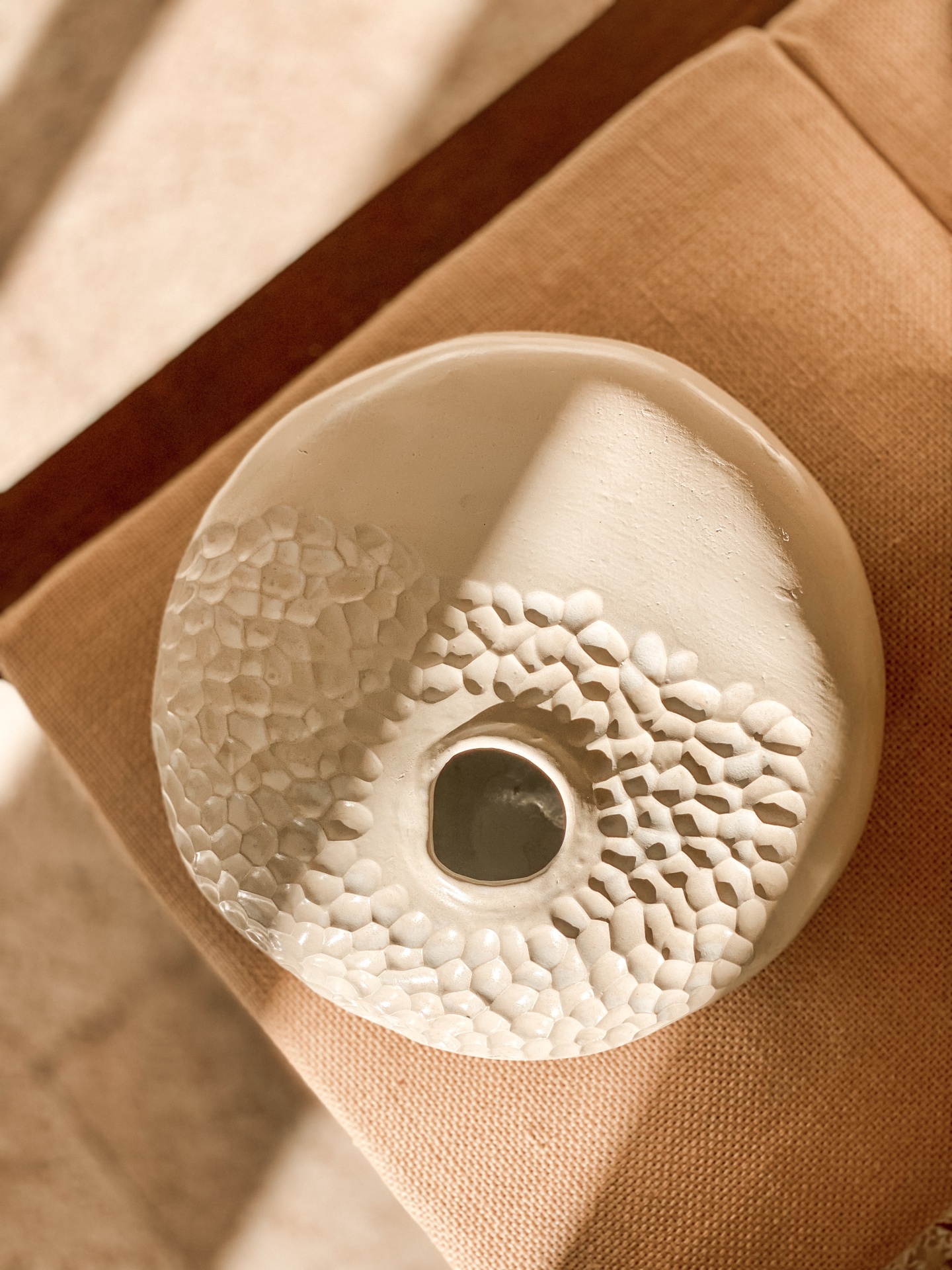 • Vaso decorativo redondo branco com textura em relevo sobre almofada castanha