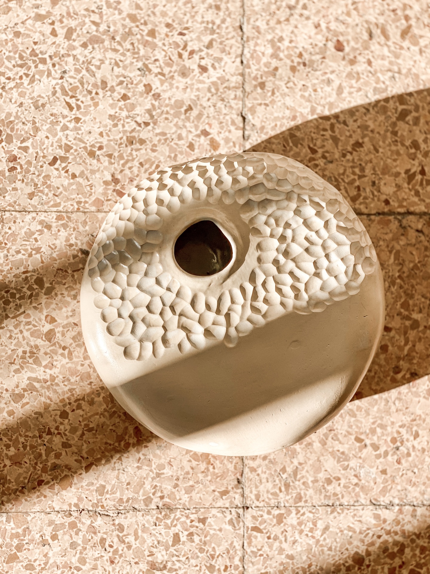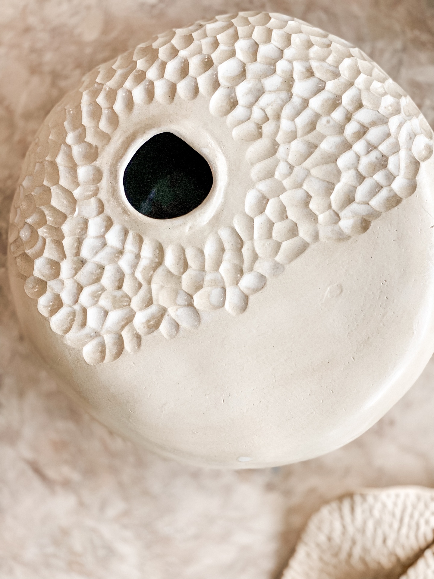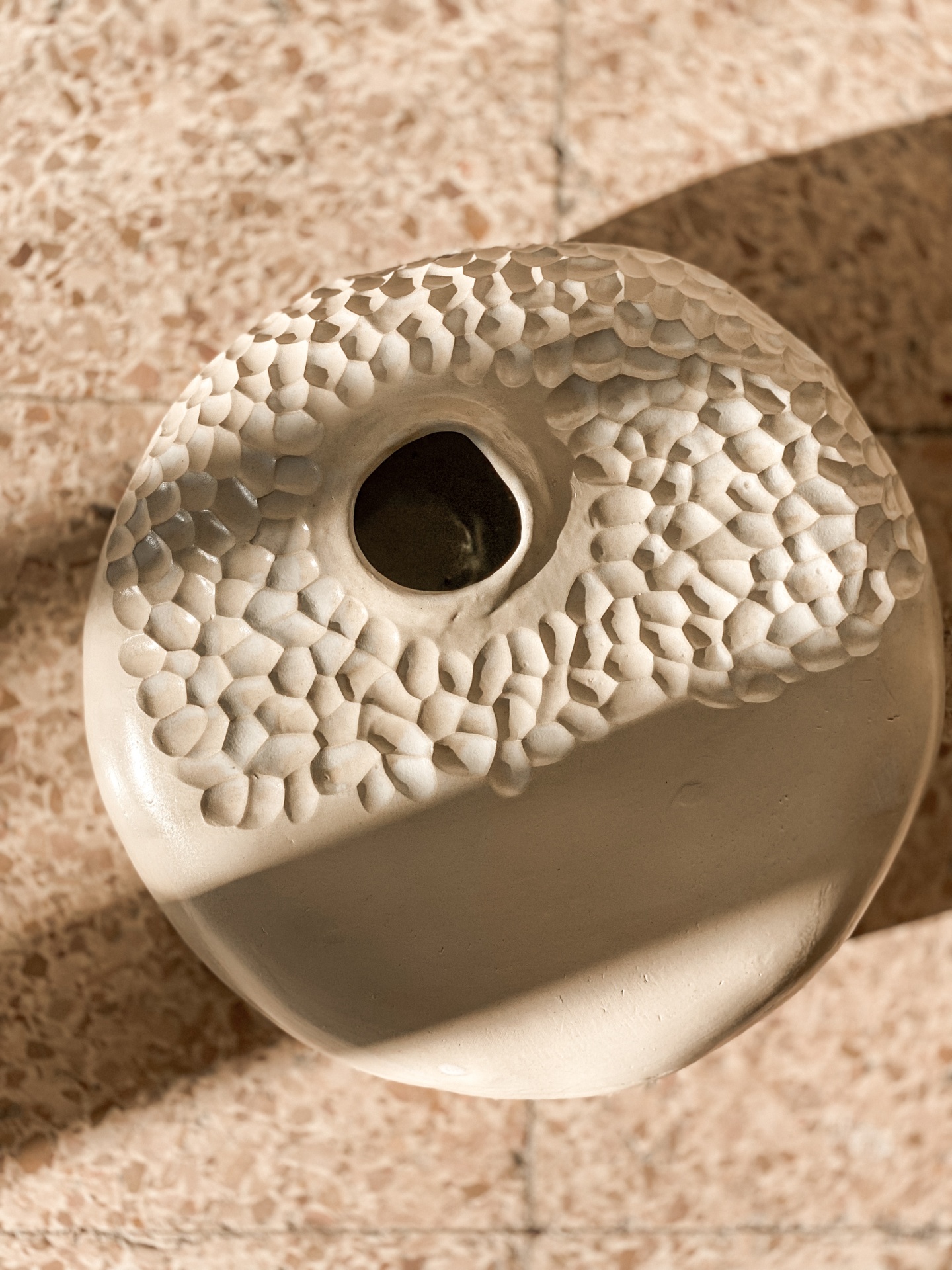 • Vaso redondo em cerâmica bege com textura granulada e abertura central, sobre chão de pedra.