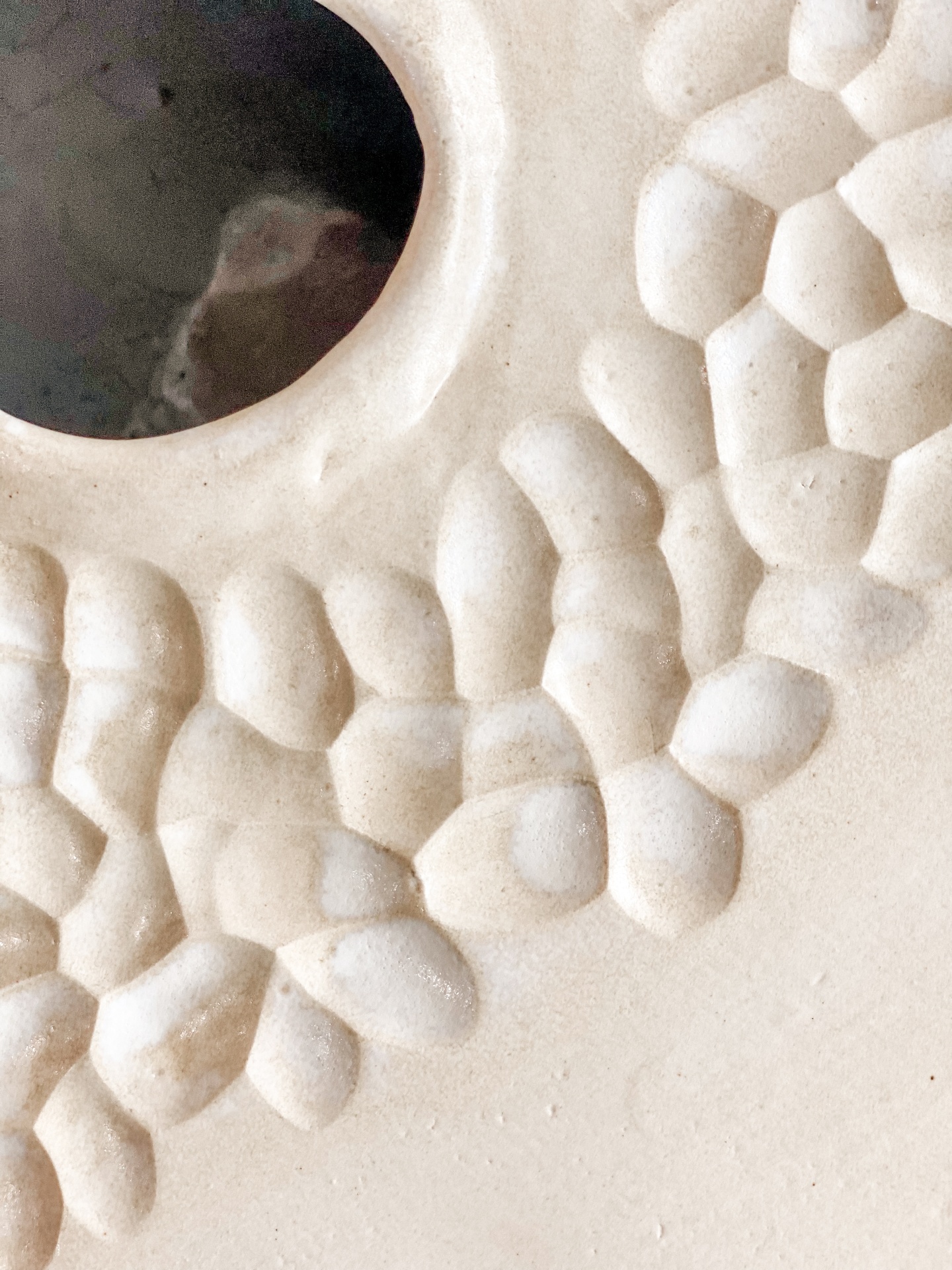 • Superfície branca texturizada com padrão de relevos e abertura central preta