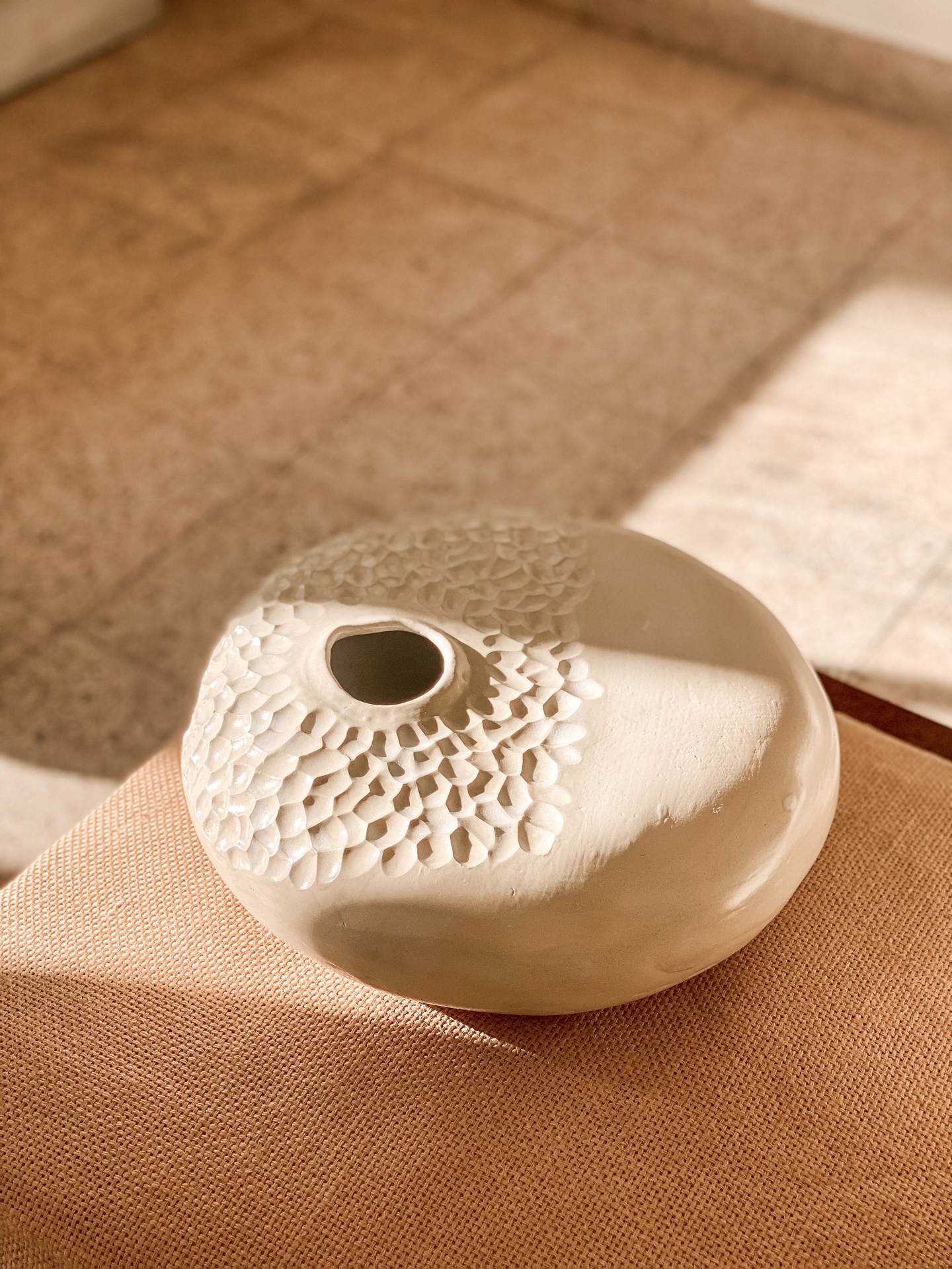 Vaso de cerâmica branco texturizado sobre chão de mosaico castanho claro