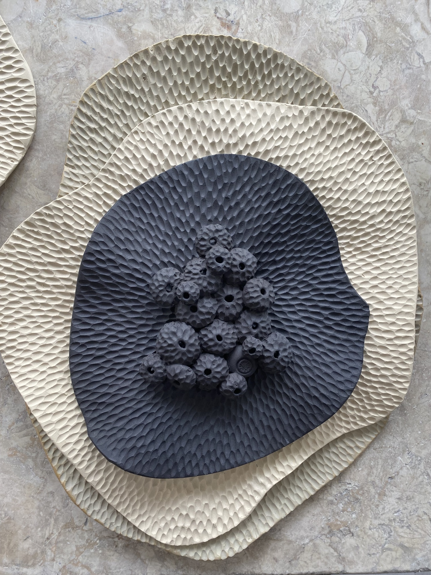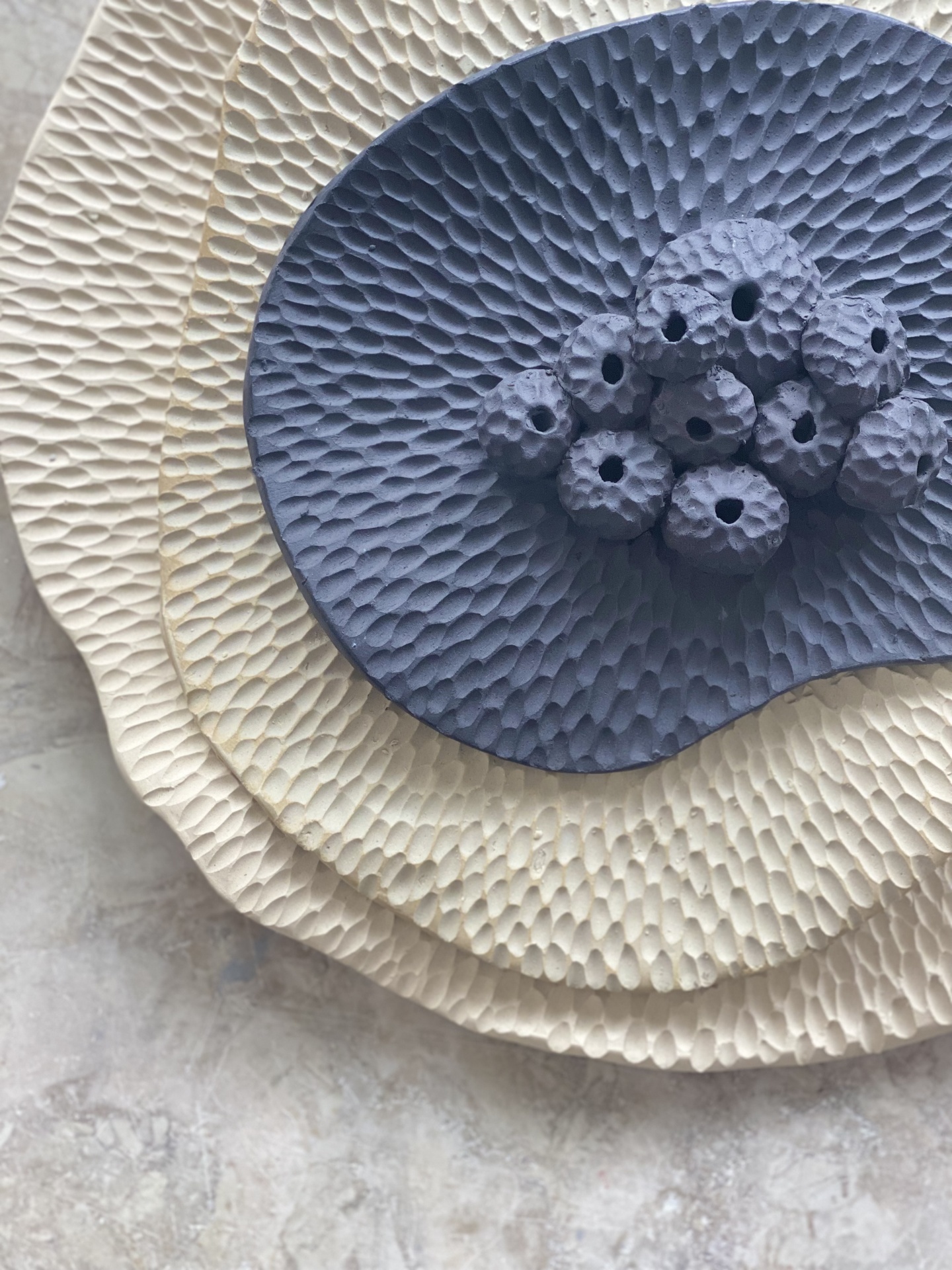 “Flores de Areia” são esculturas de parede inspiradas nas cores e texturas das praias portuguesas. As formas sobrepostas falam das falésias, sedimentos e da erosão lenta moldada pelo mar e pelo vento.