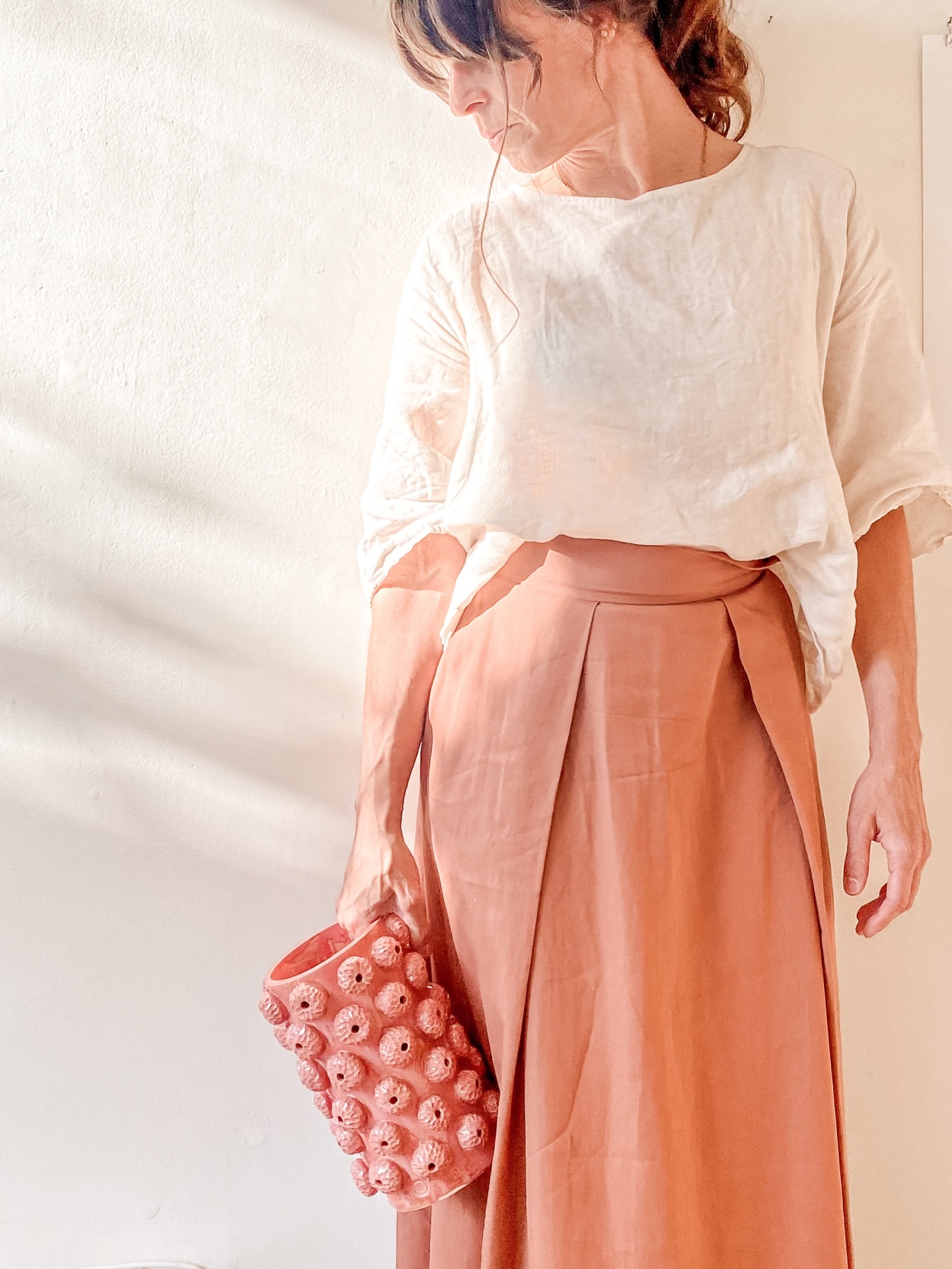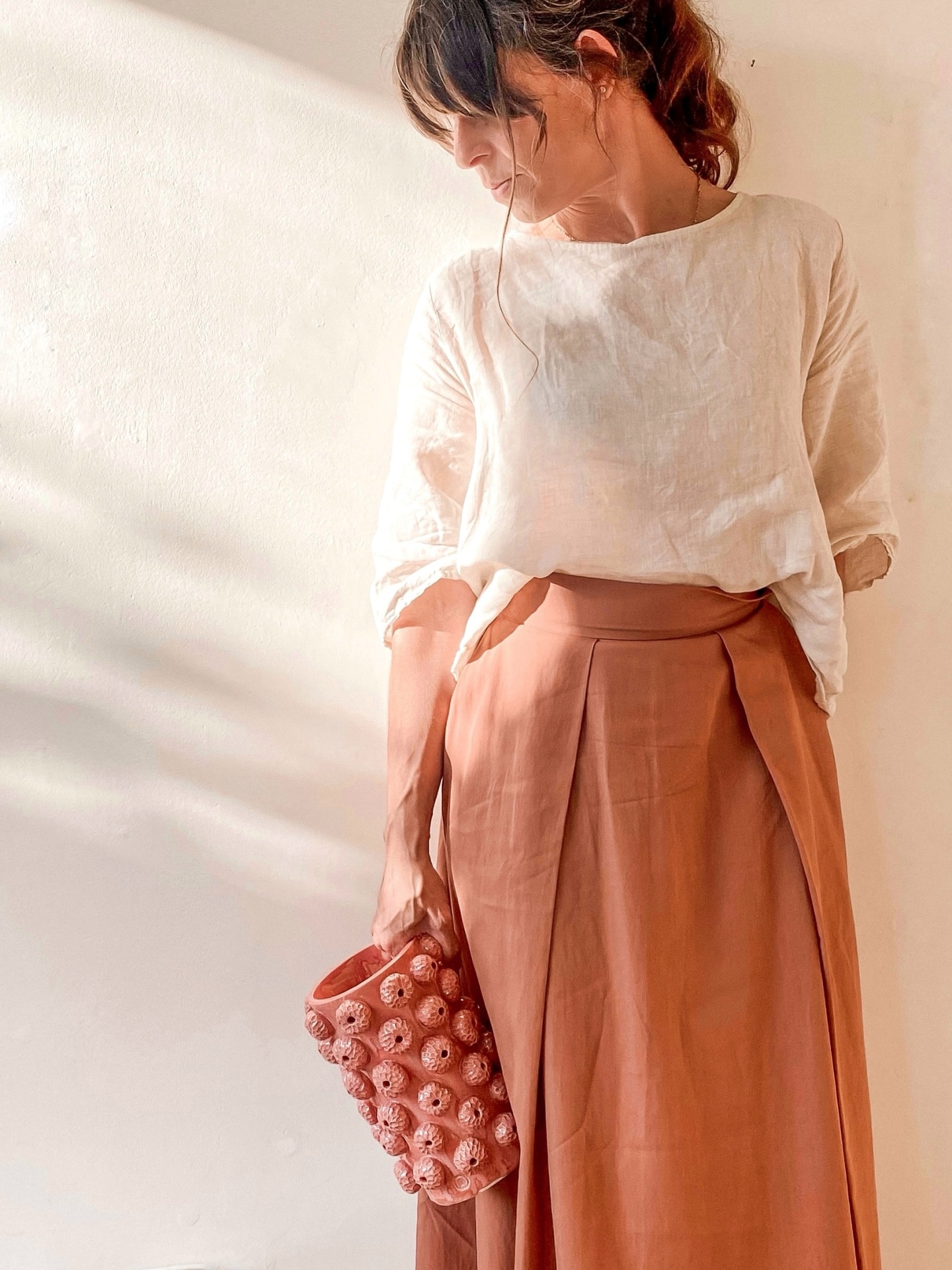 • Mulher com blusa branca, saia terracota e bolsa rosa texturizada