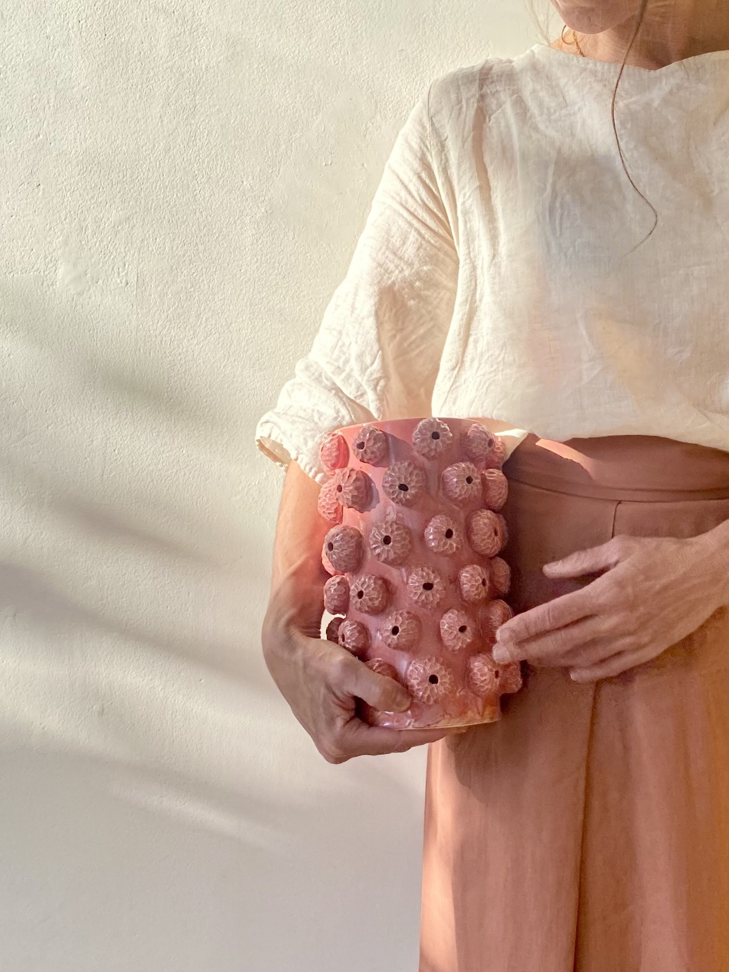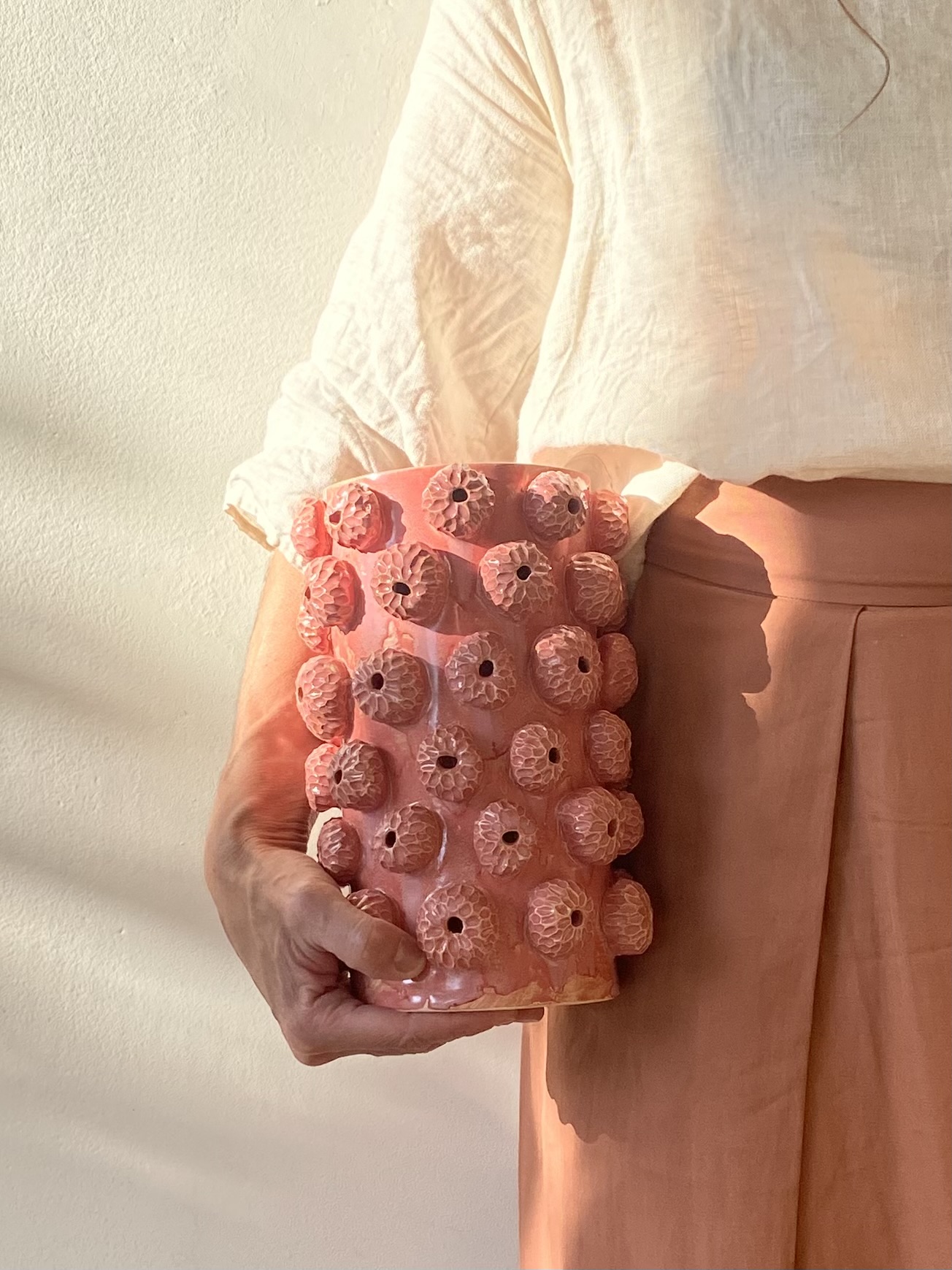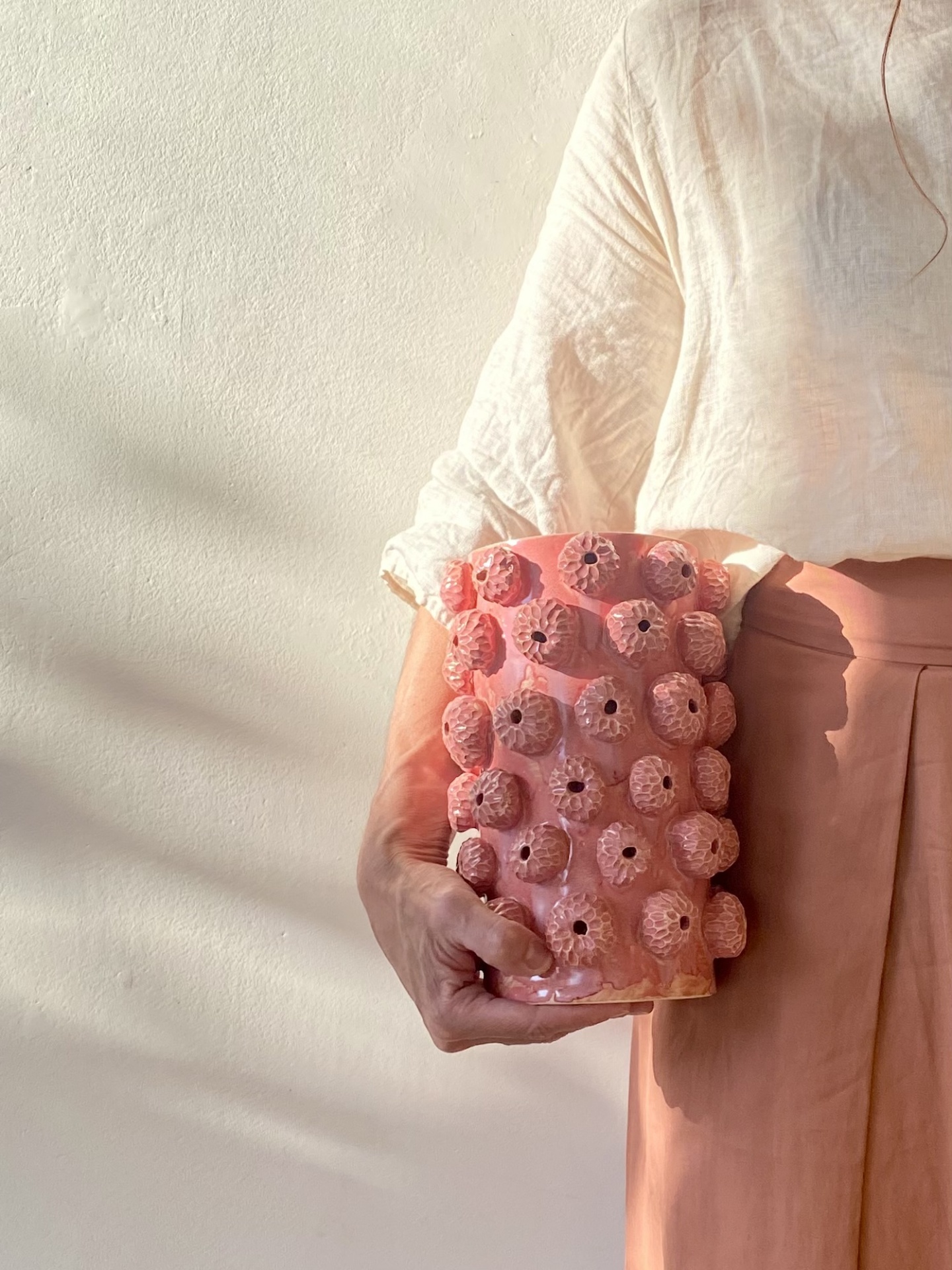 • Vaso cerâmica rosa com bolhas em relevo segurado por pessoa com roupa clara.