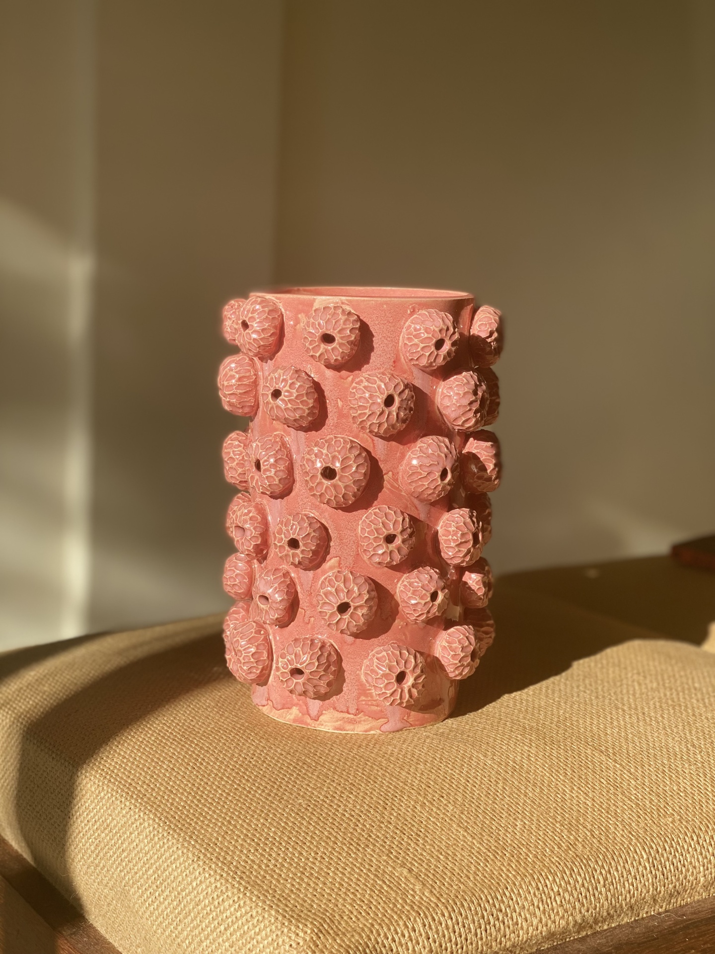 • Vaso de cerâmica rosa com textura de gomos redondos perfurados