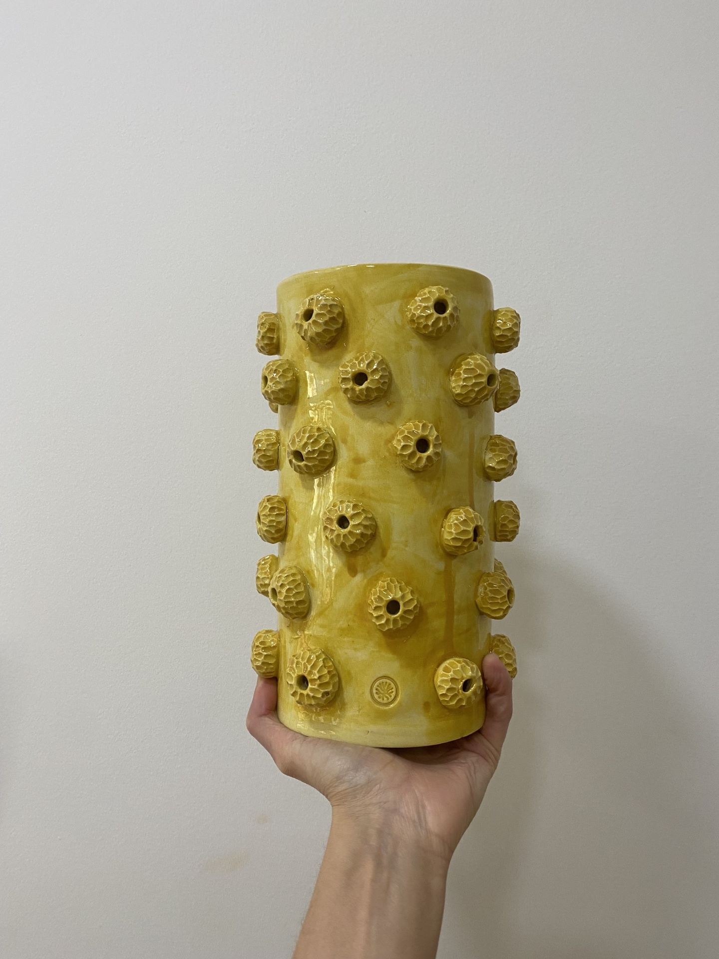 • Vaso amarelo cilíndrico em cerâmica com relevos esféricos texturizados