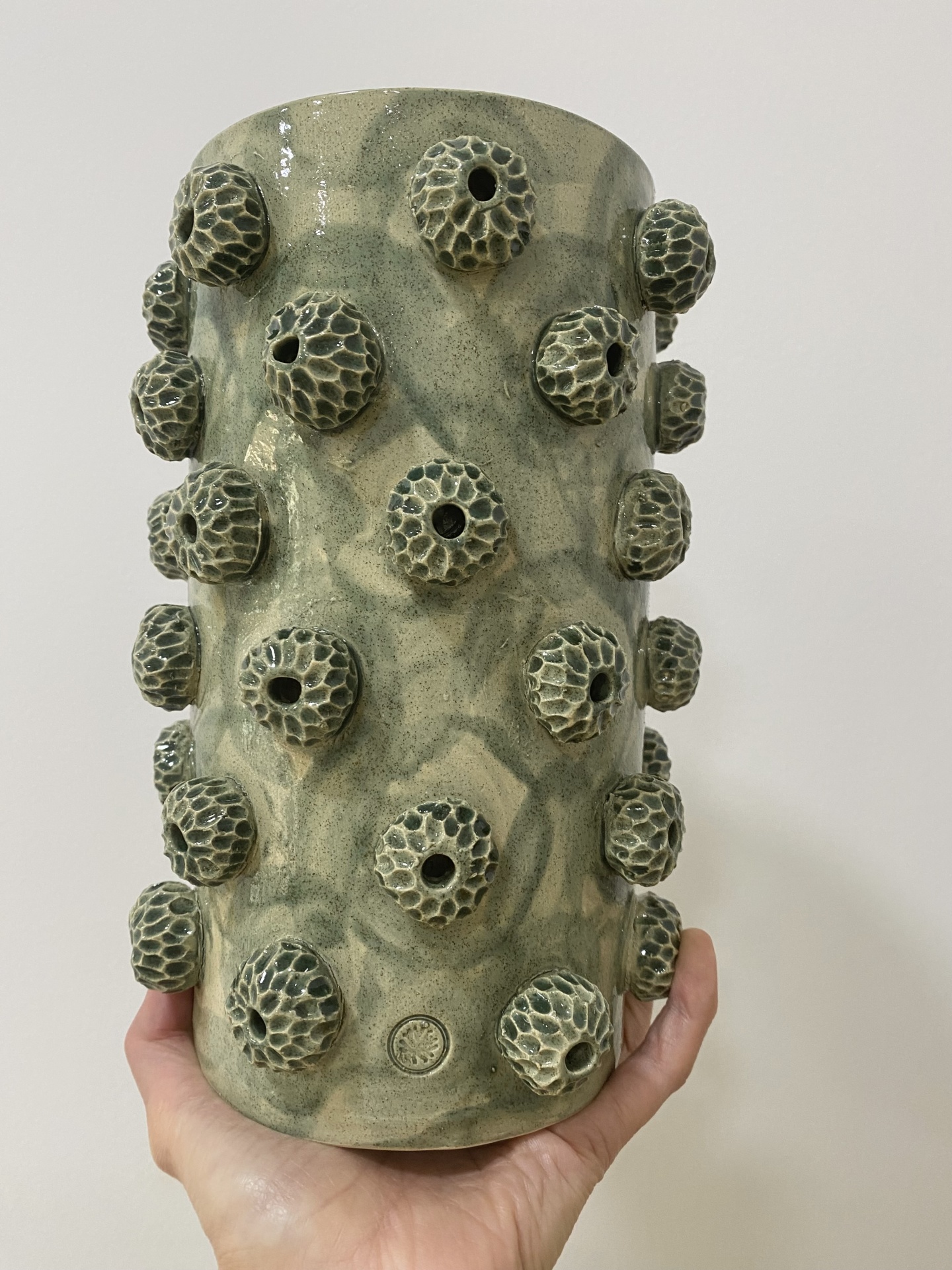 • Vaso cilíndrico verde de cerâmica com botões salientes