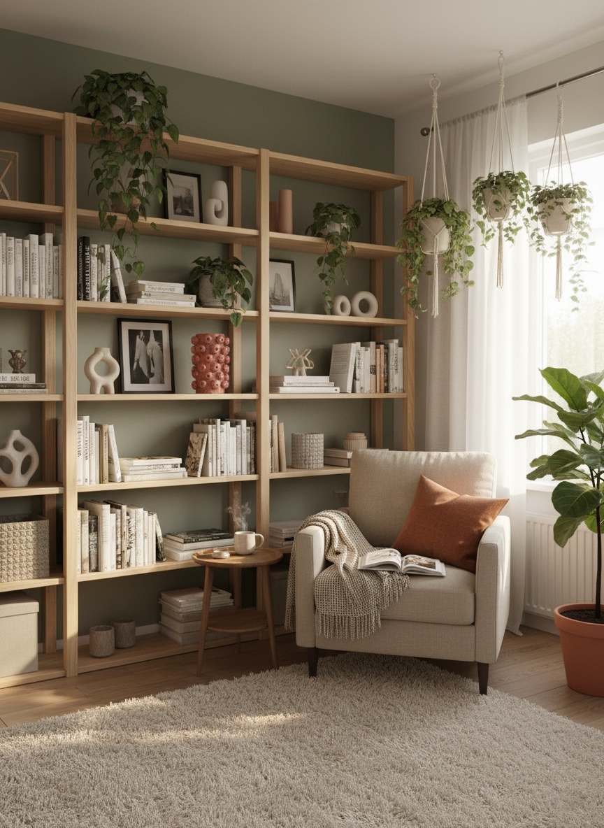 • Estante de madeira com livros e plantas e poltrona com almofada num ambiente confortável e iluminado
