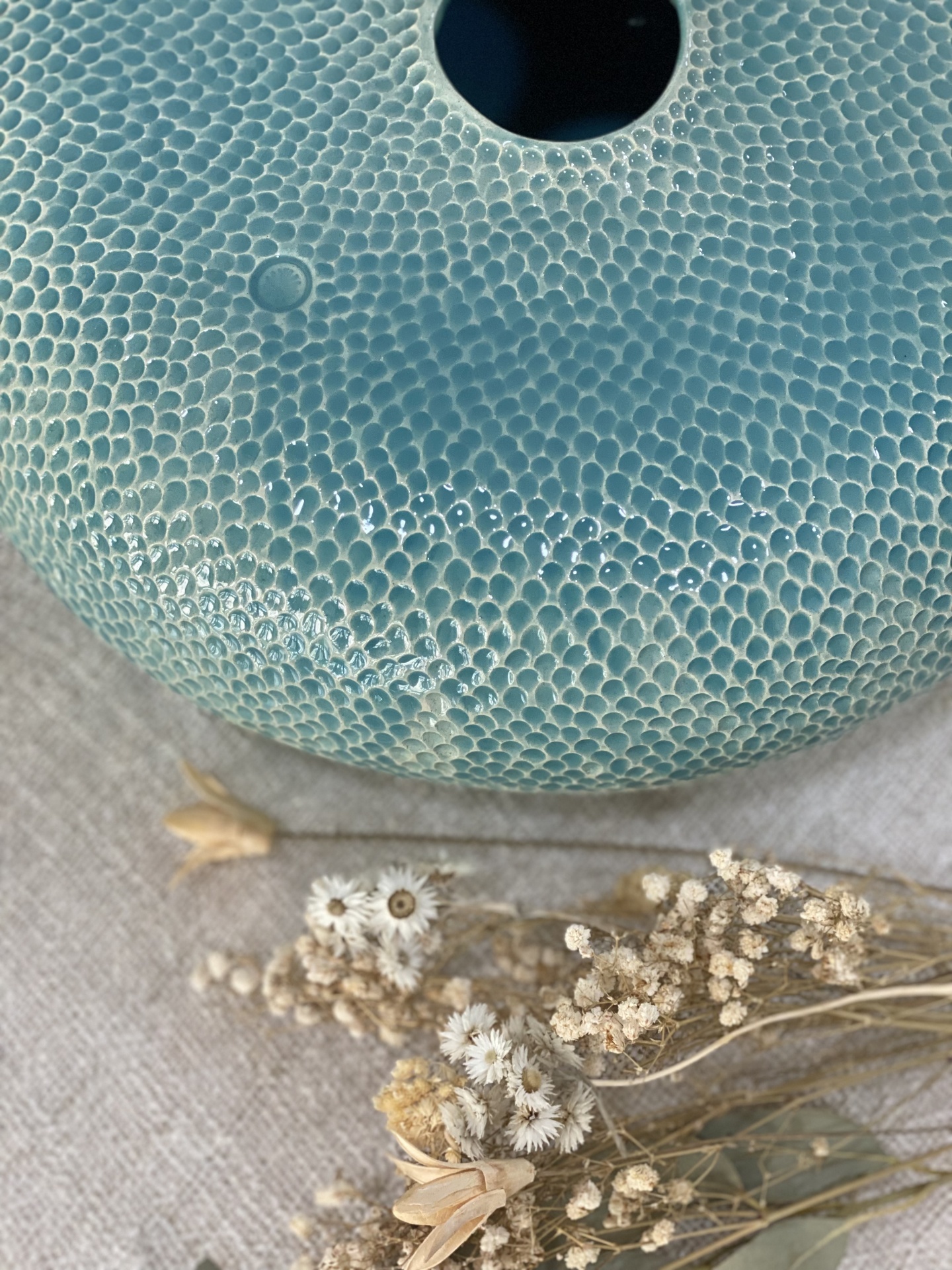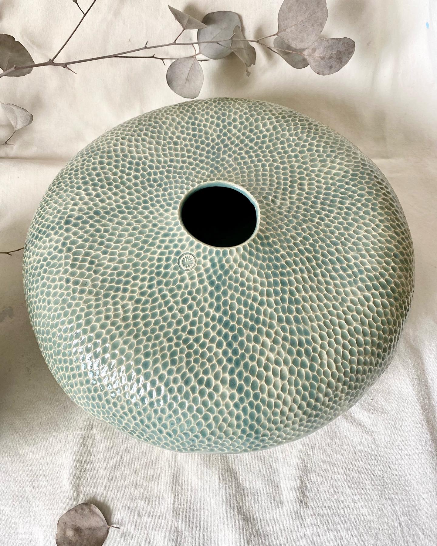 • Vaso redondo verde água com padrão escamas em cerâmica sobre tecido branco com folhas secas