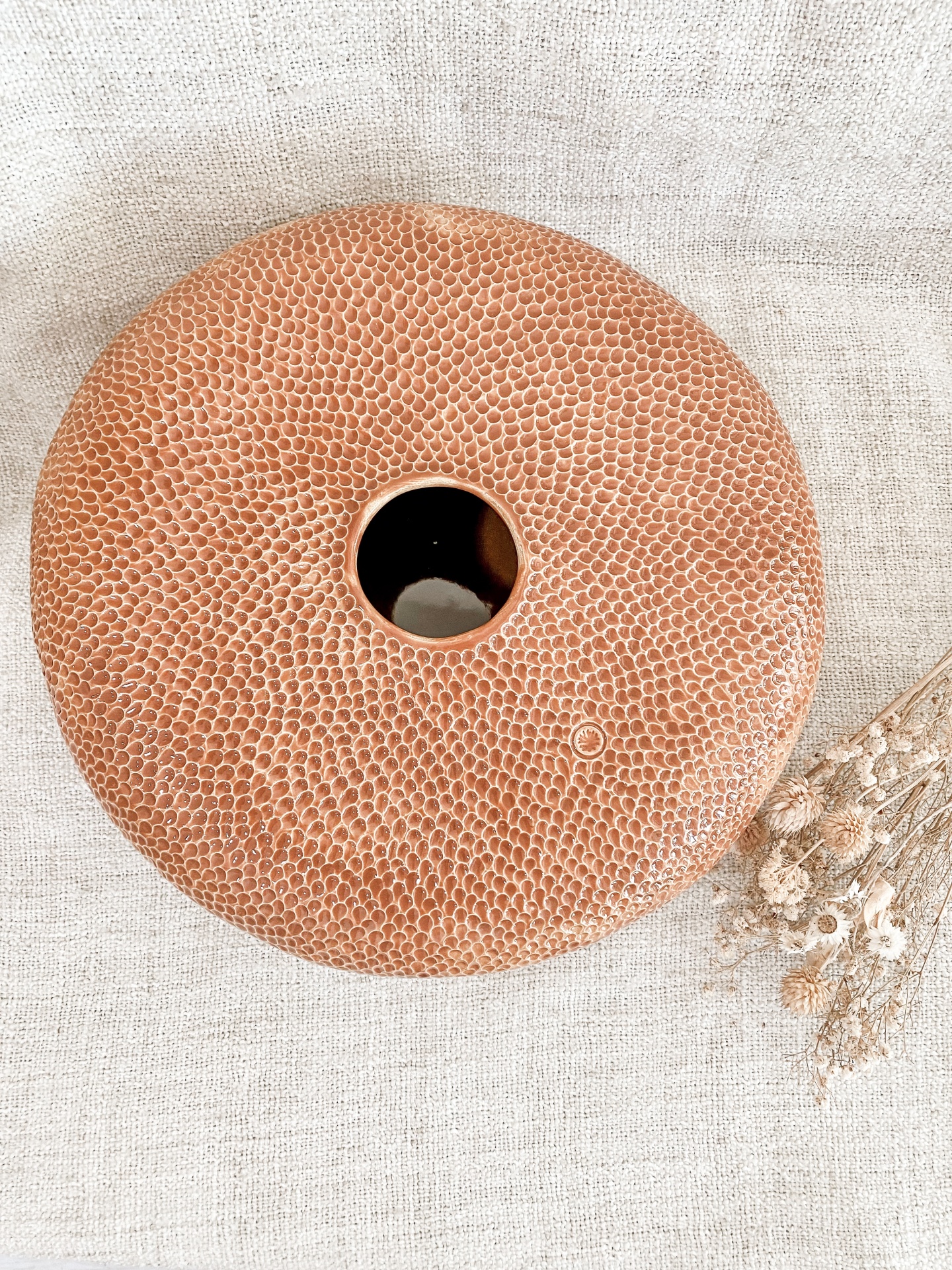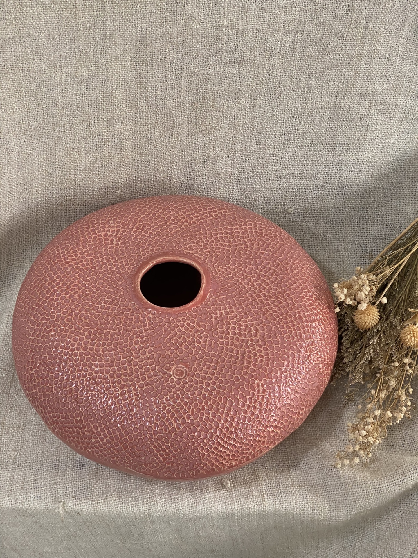 • Florero redondo rosa con textura y flores secas sobre tela beige