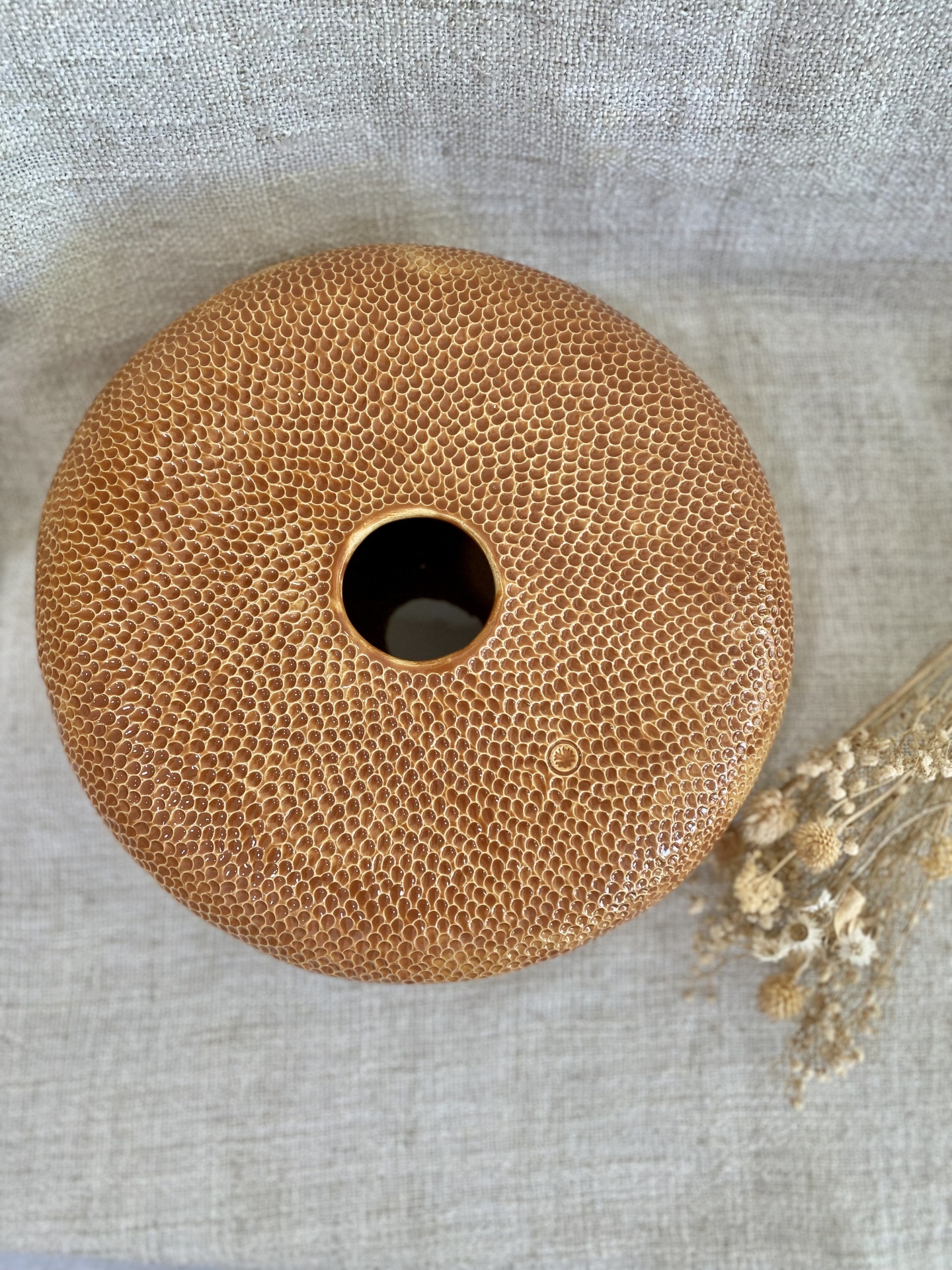 • Vaso redondo de cerâmica castanho texturizado com abertura central sobre tecido cinzento e ramos secos
