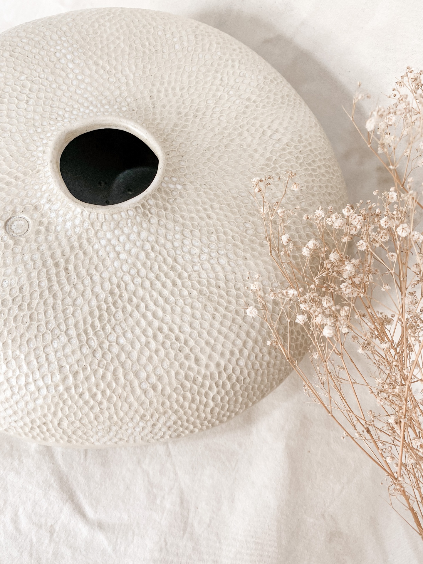 vaso branco com textura e flores secas sobre tecido bege