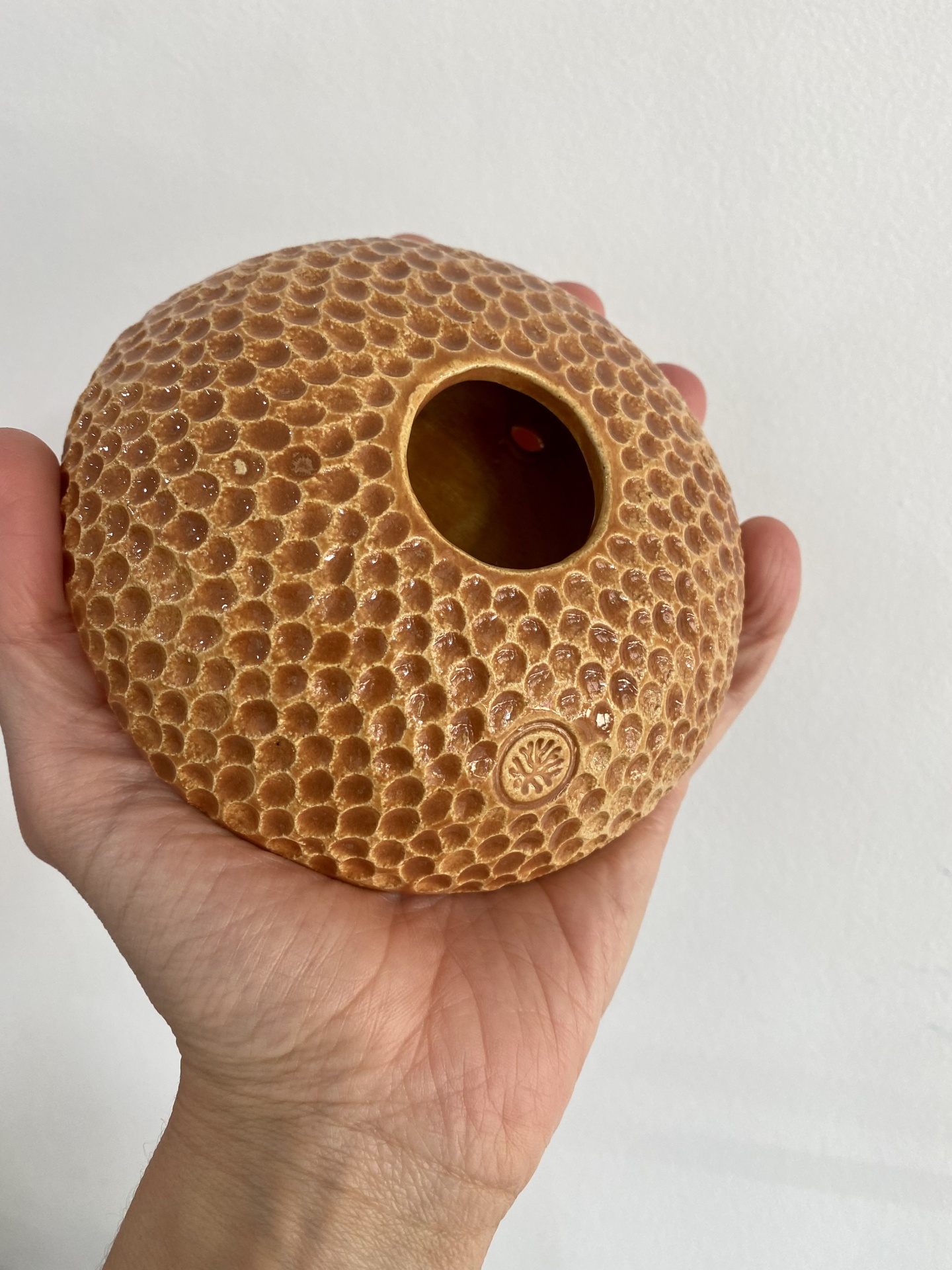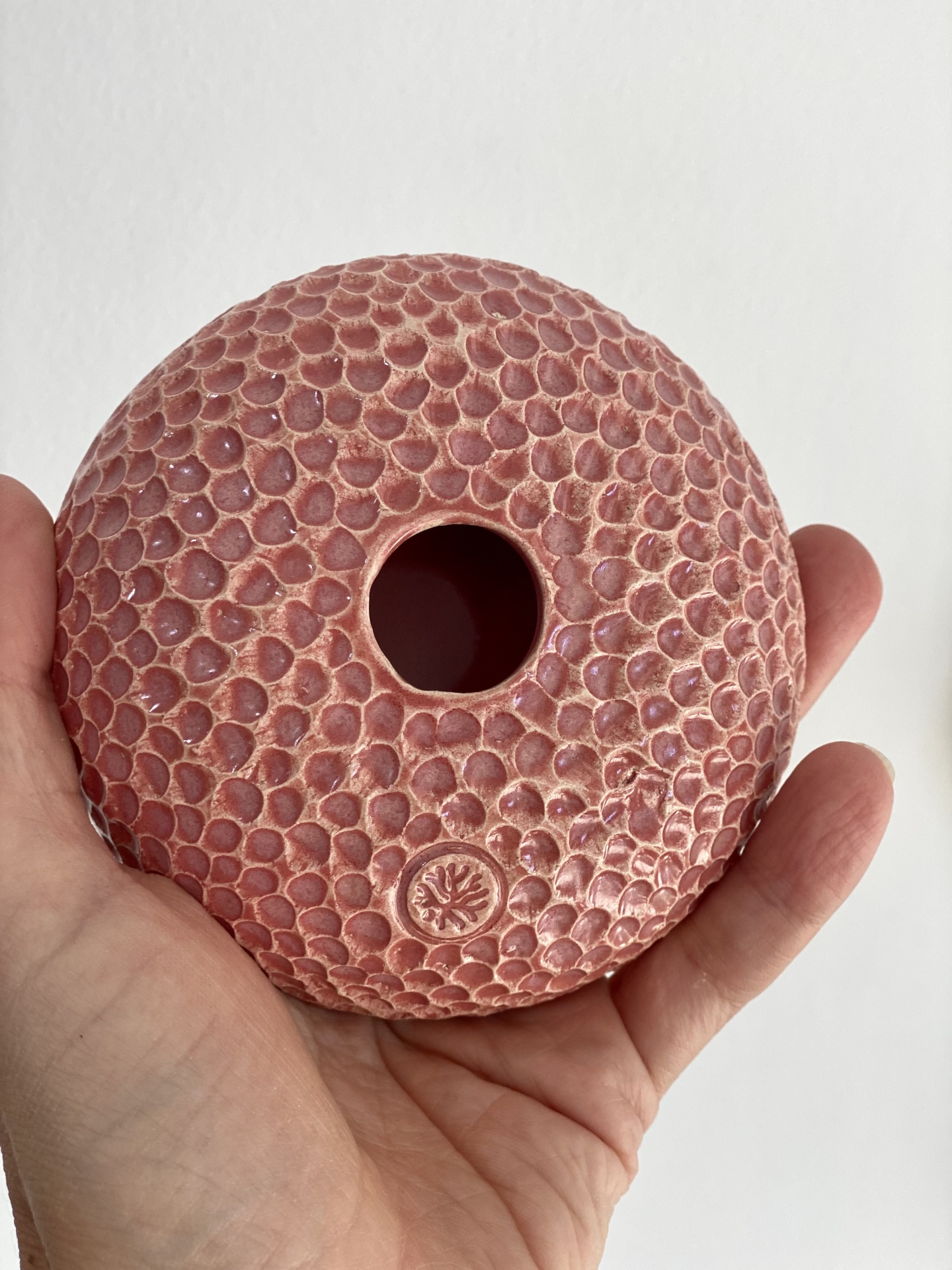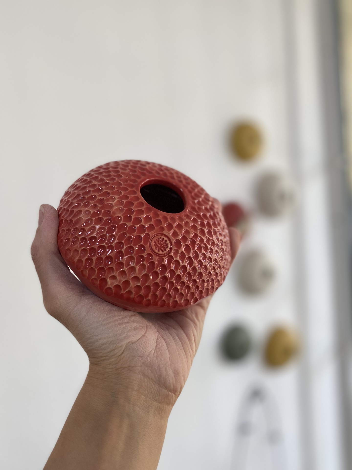 • Objeto cerâmico vermelho texturizado com orifício ao centro, na mão, com outros objetos coloridos desfocados ao fundo