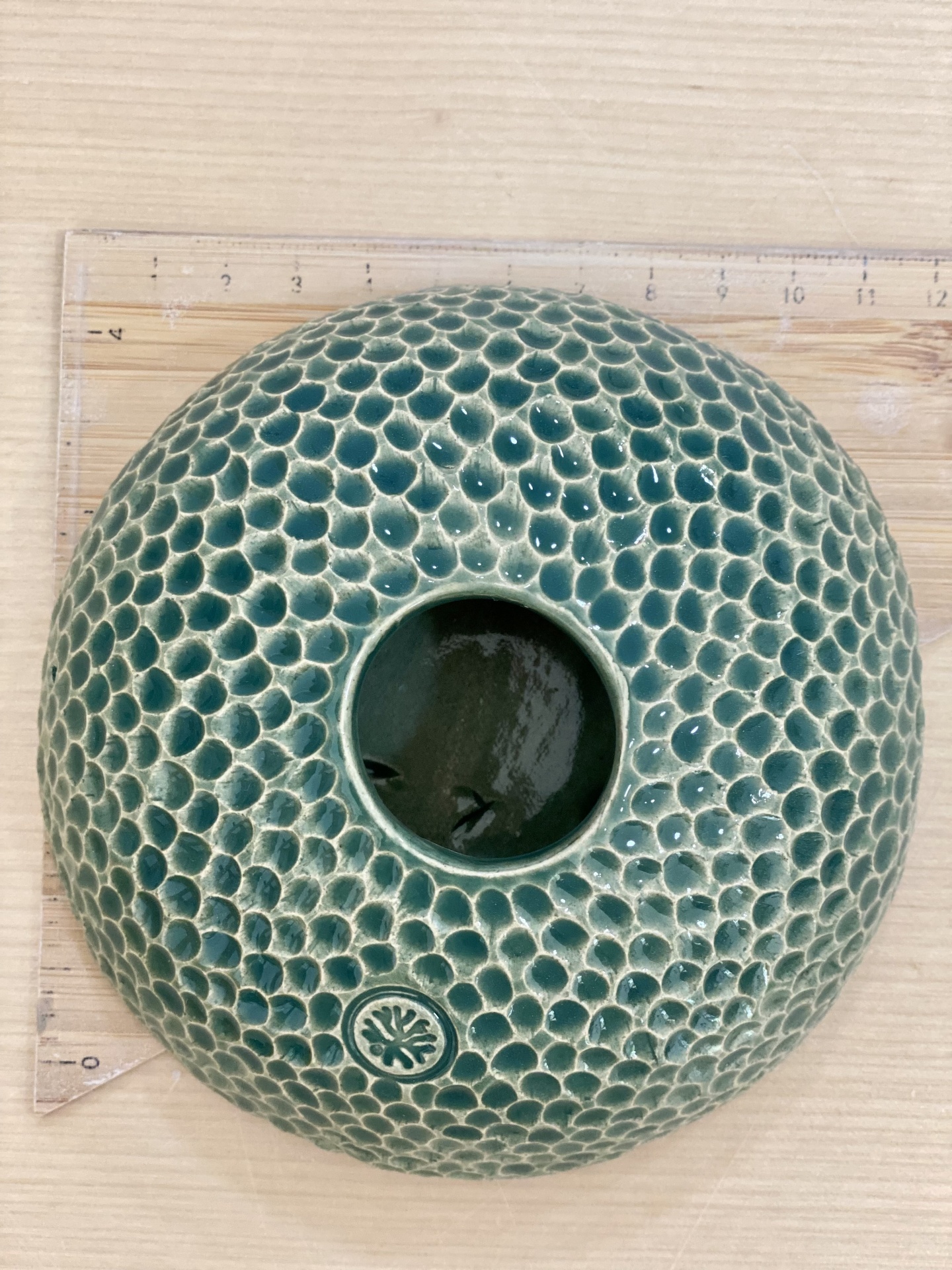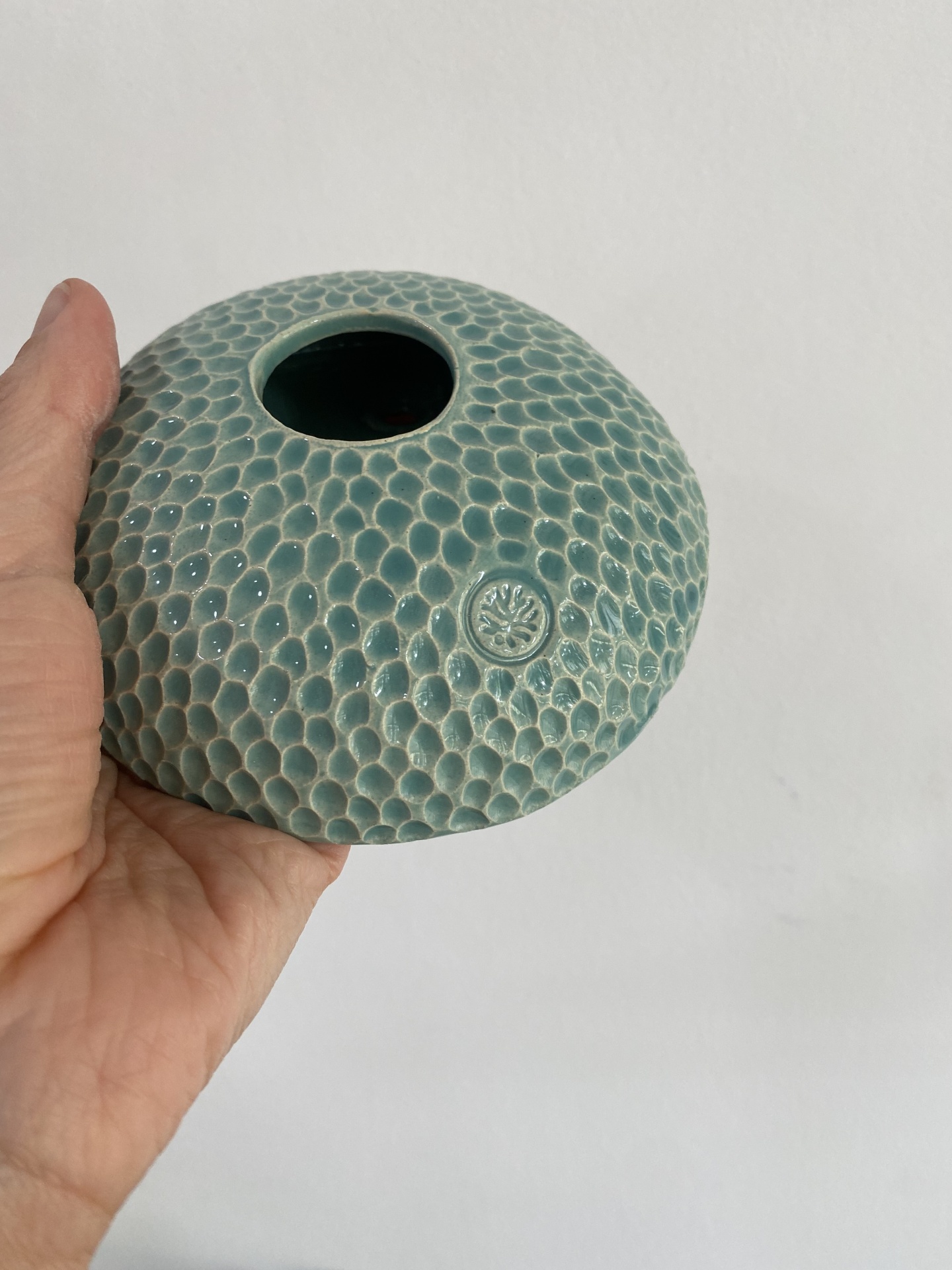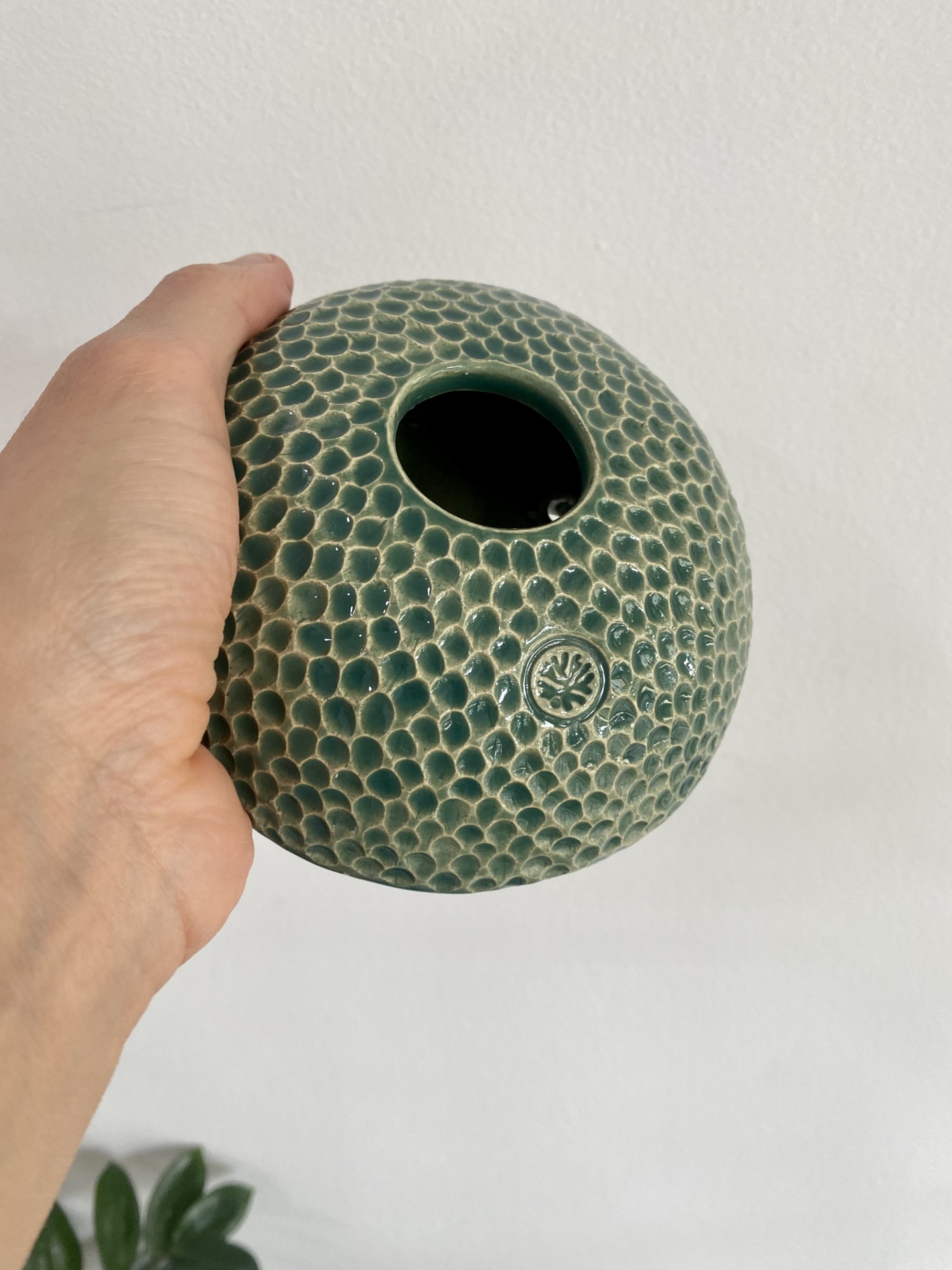 • Vaso cerâmico verde com textura de escamas e selo circular