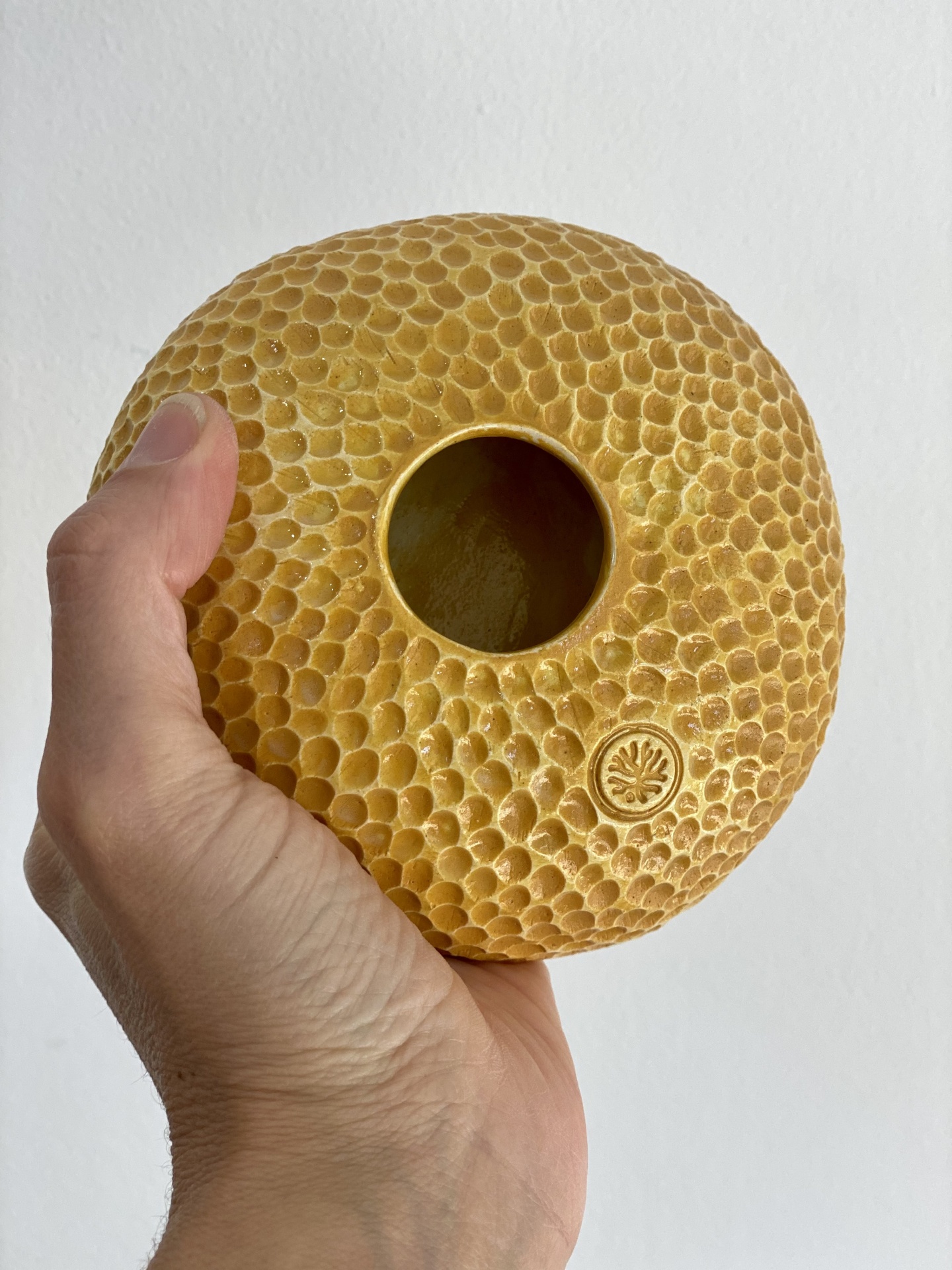 • Vaso cerâmico amarelo texturizado em colmeia com buraco central