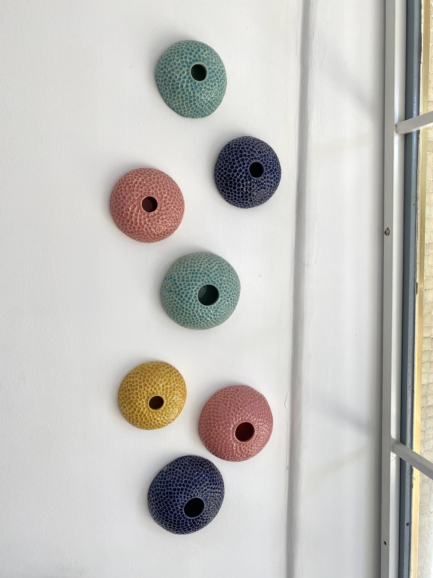 • Seis pequenos vasos cerâmicos texturizados coloridos fixados em parede branca perto de janela