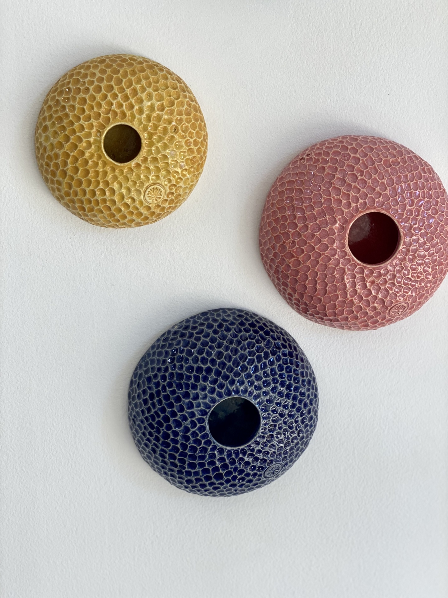 • Três vasos cerâmicos coloridos com textura bolha montados na parede.