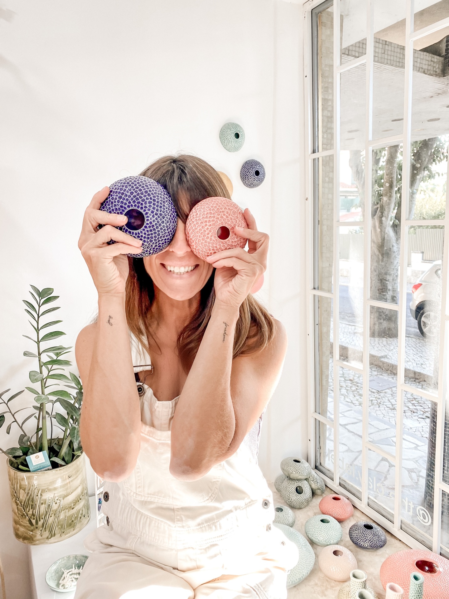 Mulher com objetos redondos coloridos perto do rosto sentada junto a janela com várias peças similares no chão