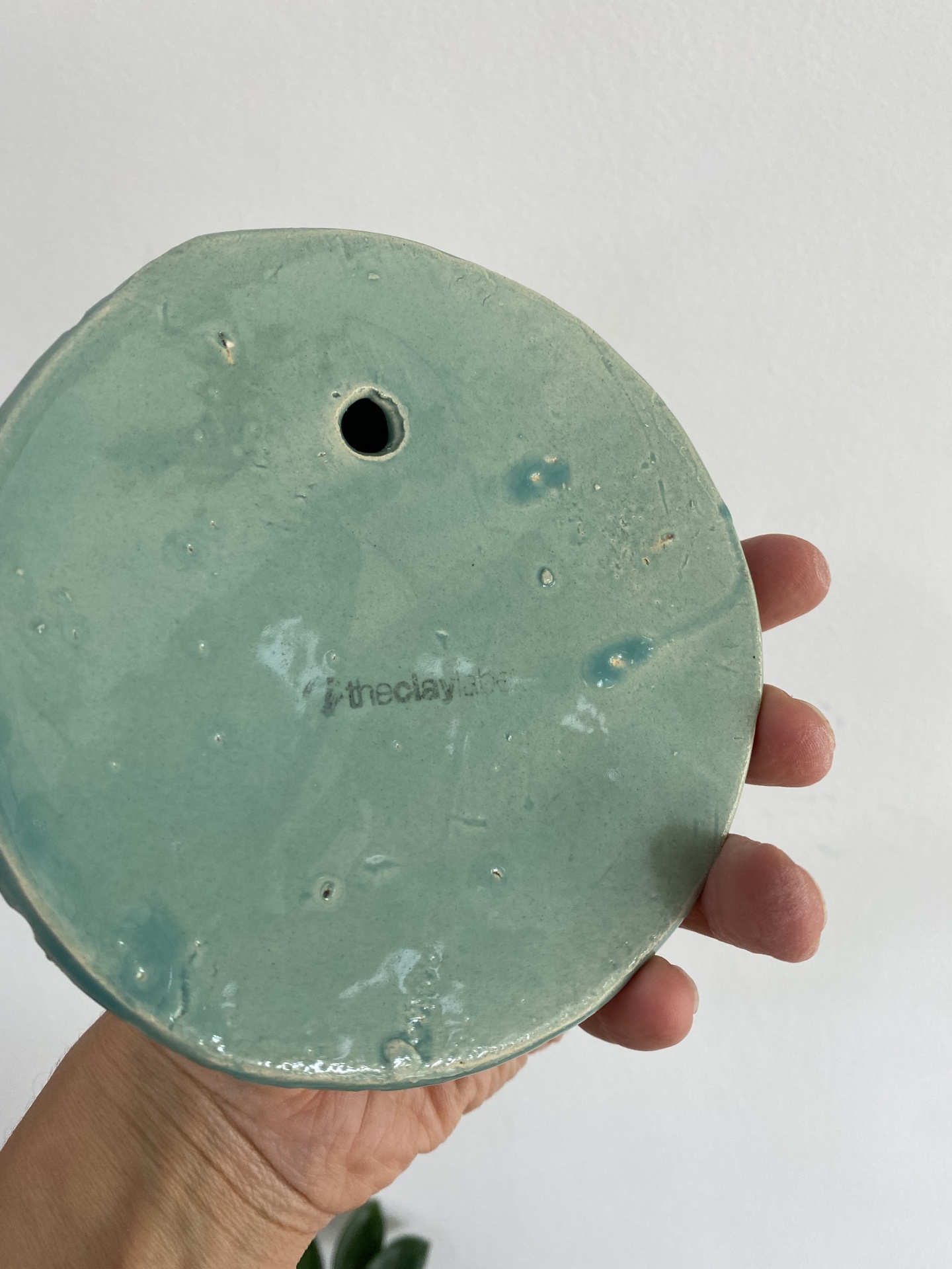 • Placa cerâmica azul esverdeada redonda com buraco e texto theclay