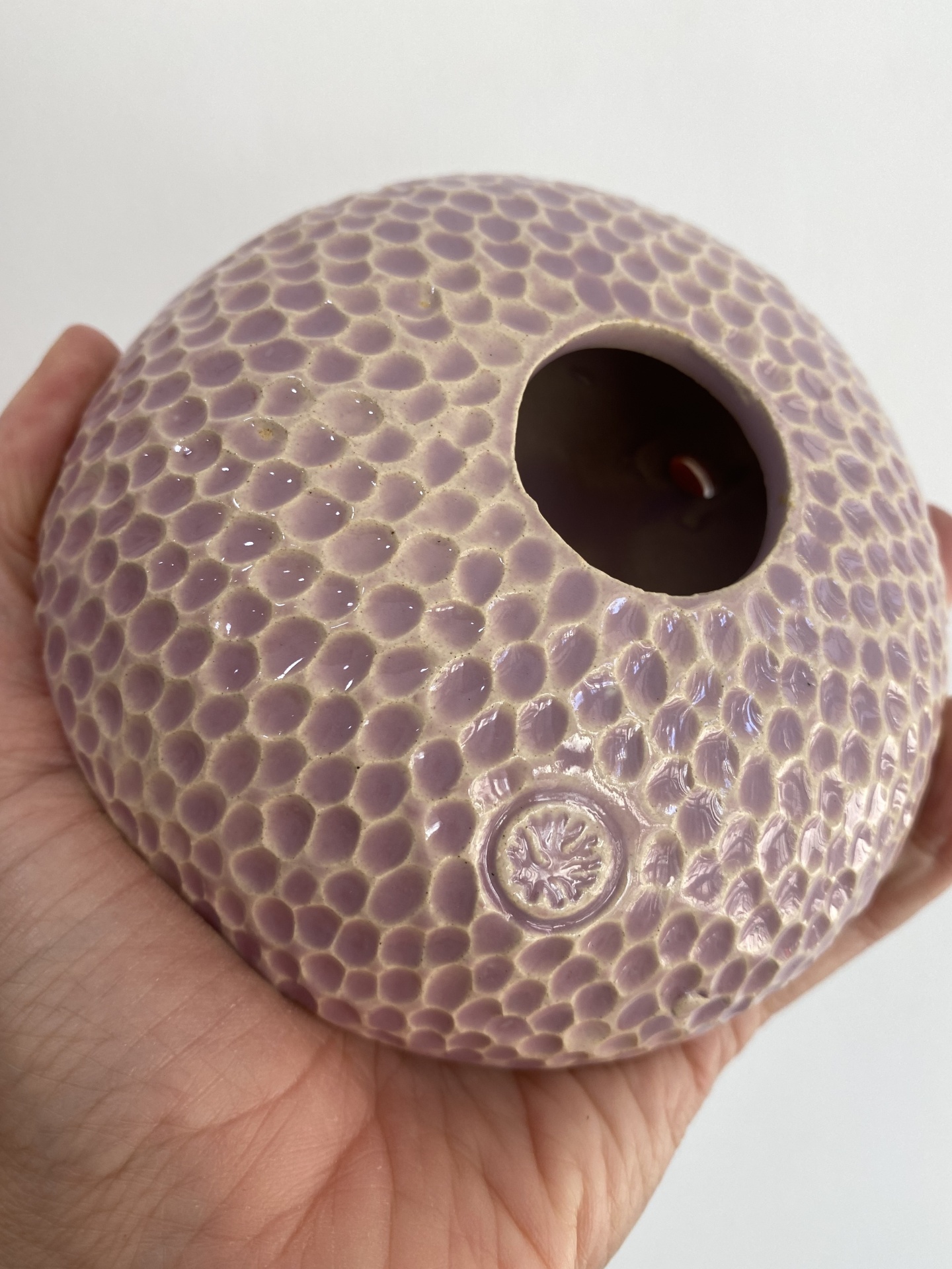 • Vela aromática em base cerâmica lilás texturizada à mão