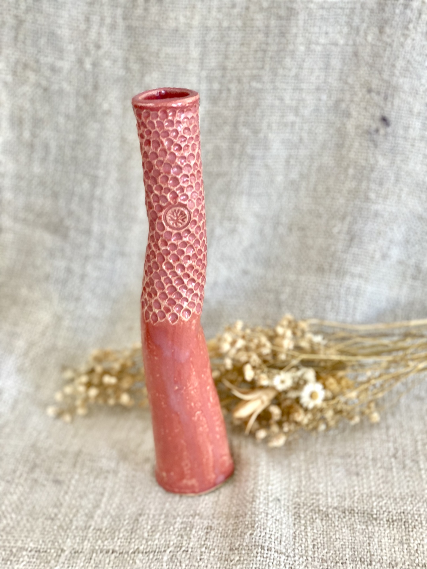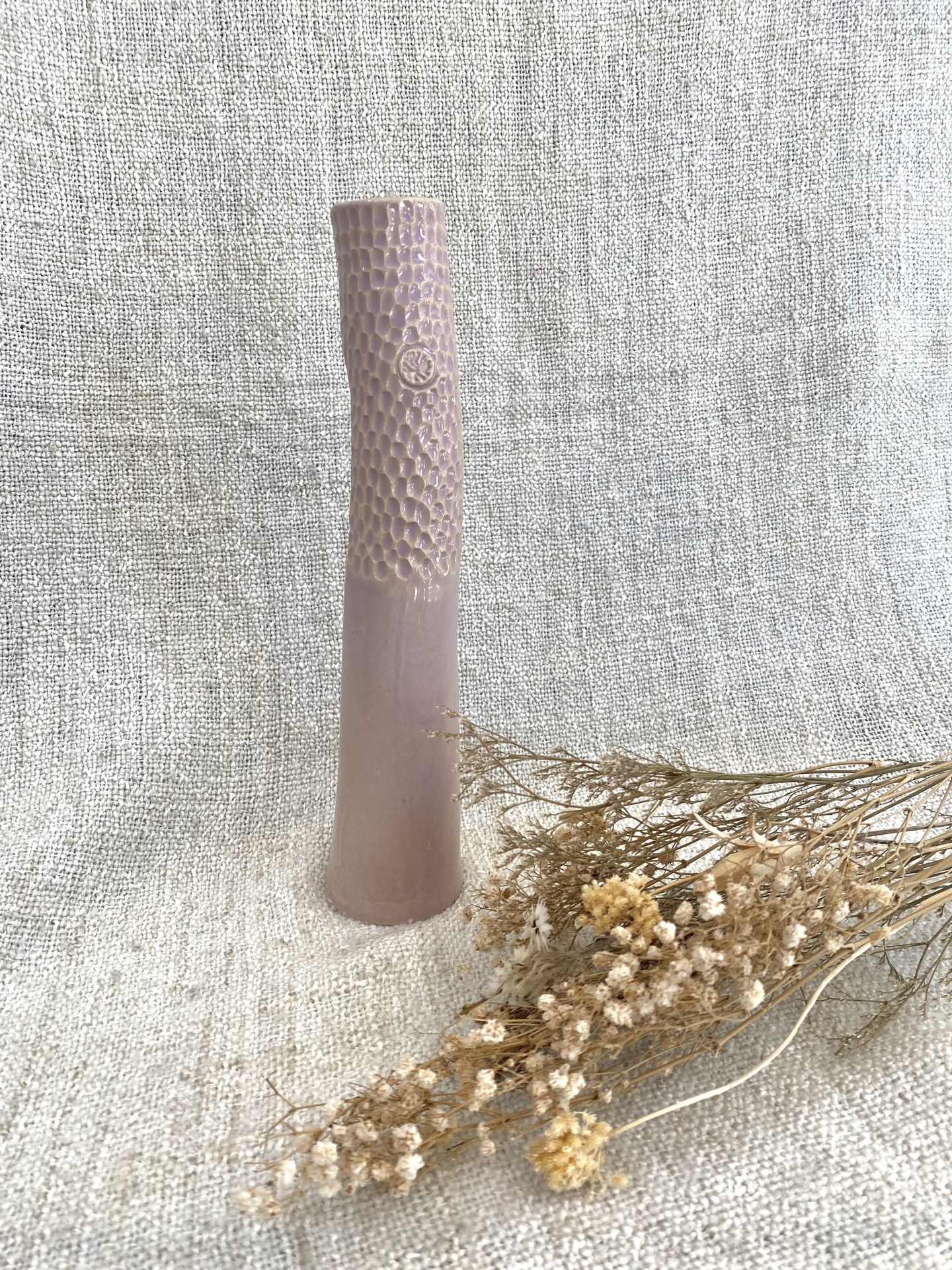 • Vaso cerâmico rosa claro com textura e flores secas em tecido bege