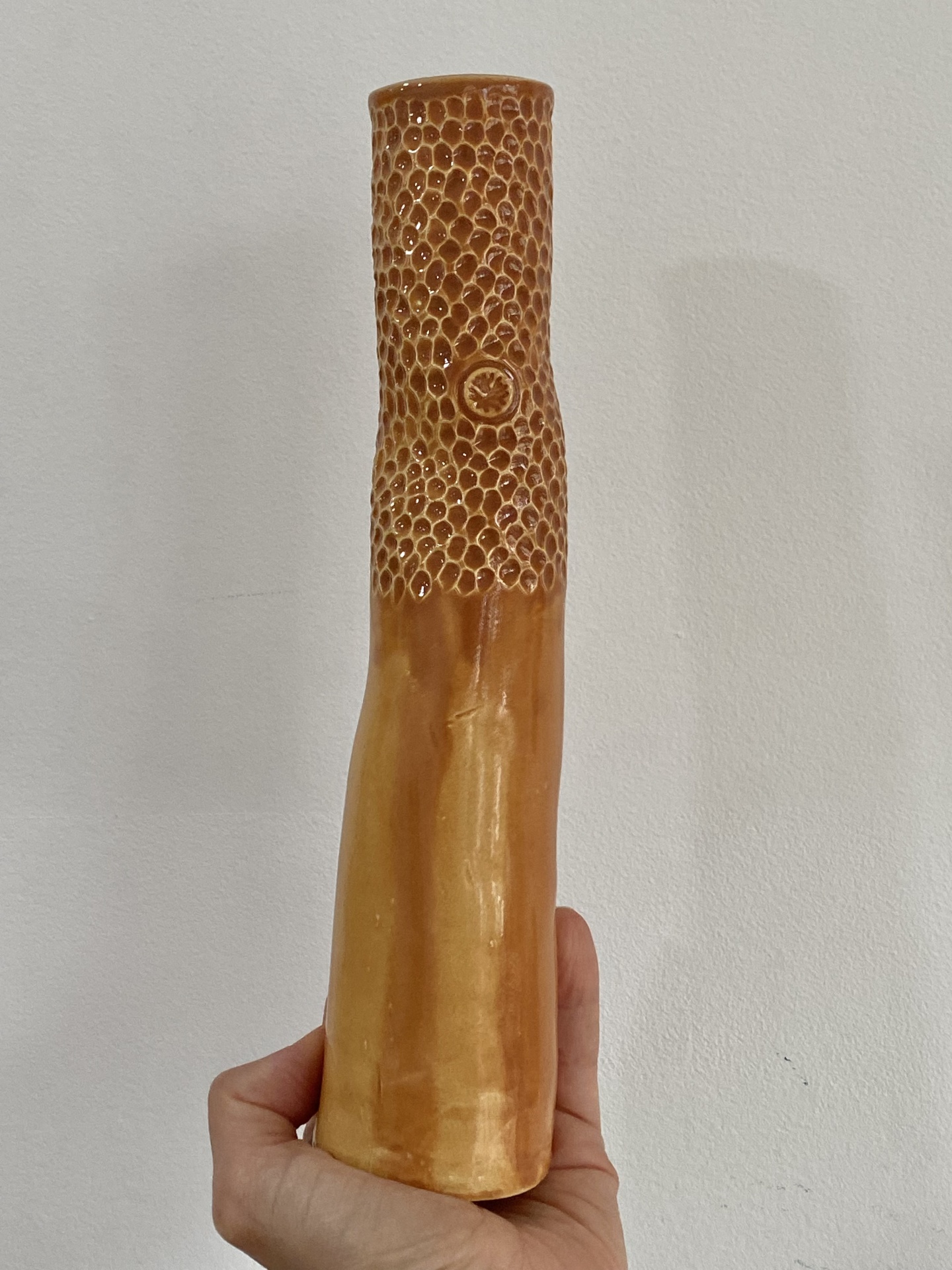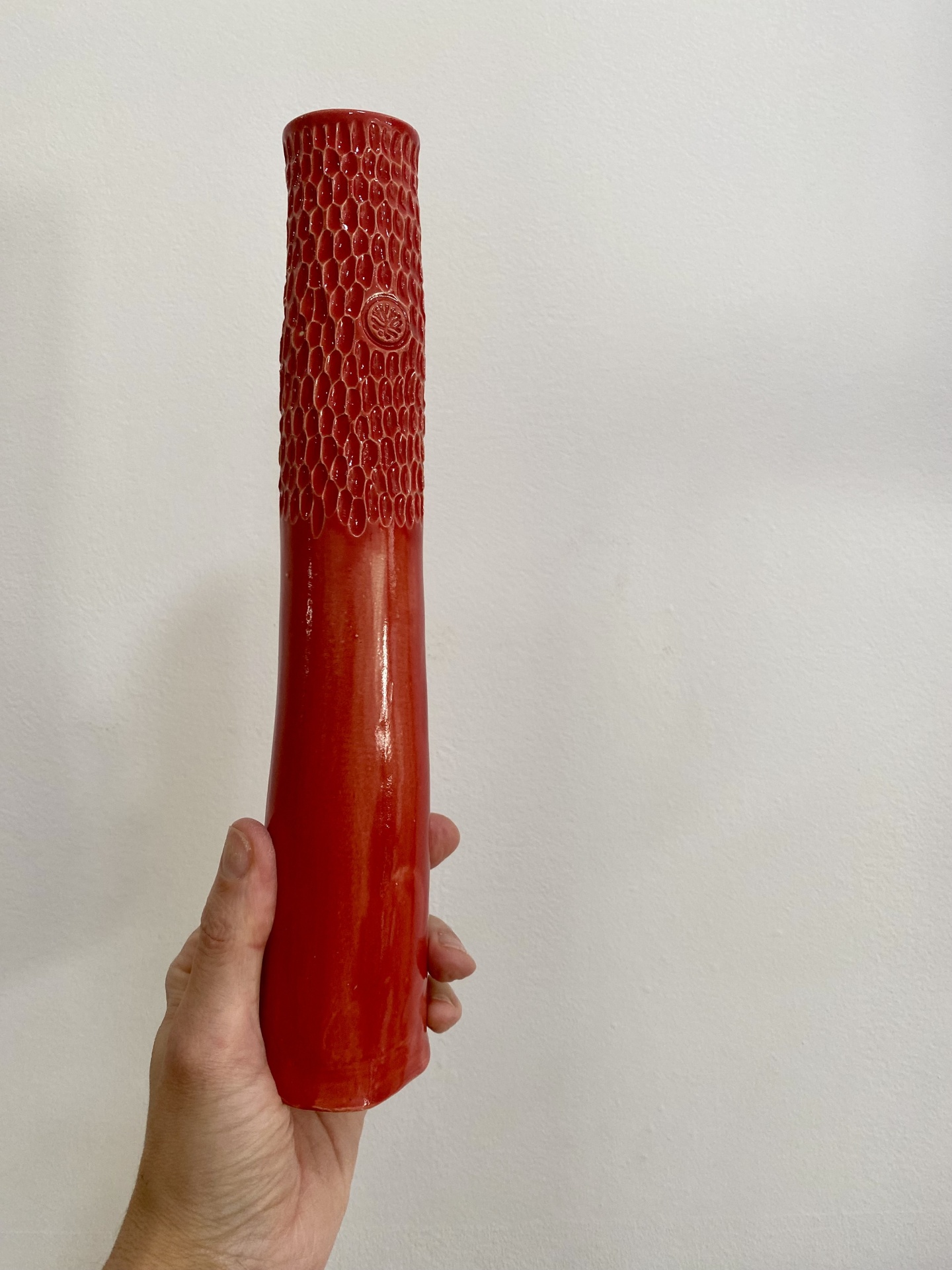 • Vaso de cerâmica vermelho com textura escamada e padrão circular