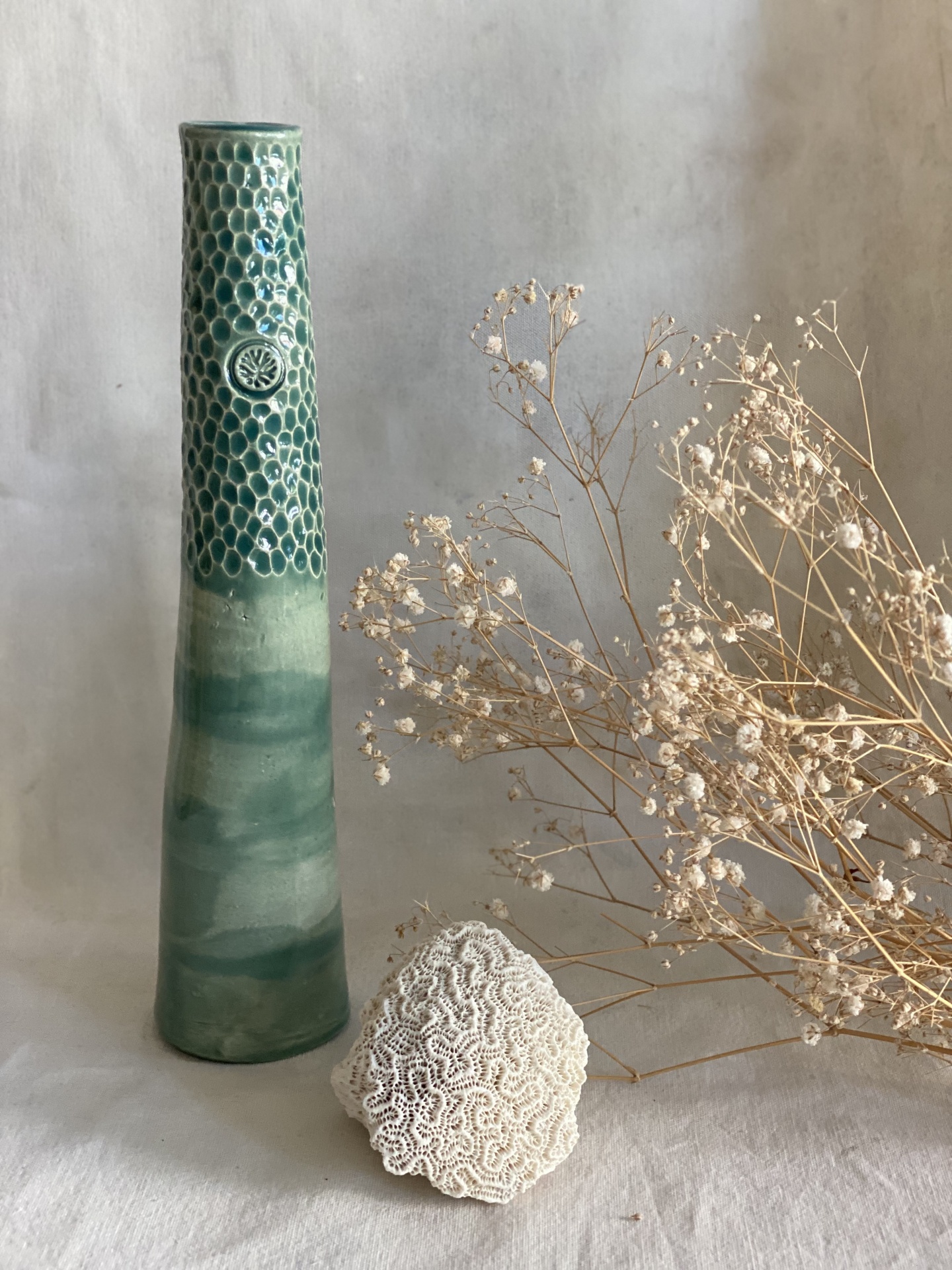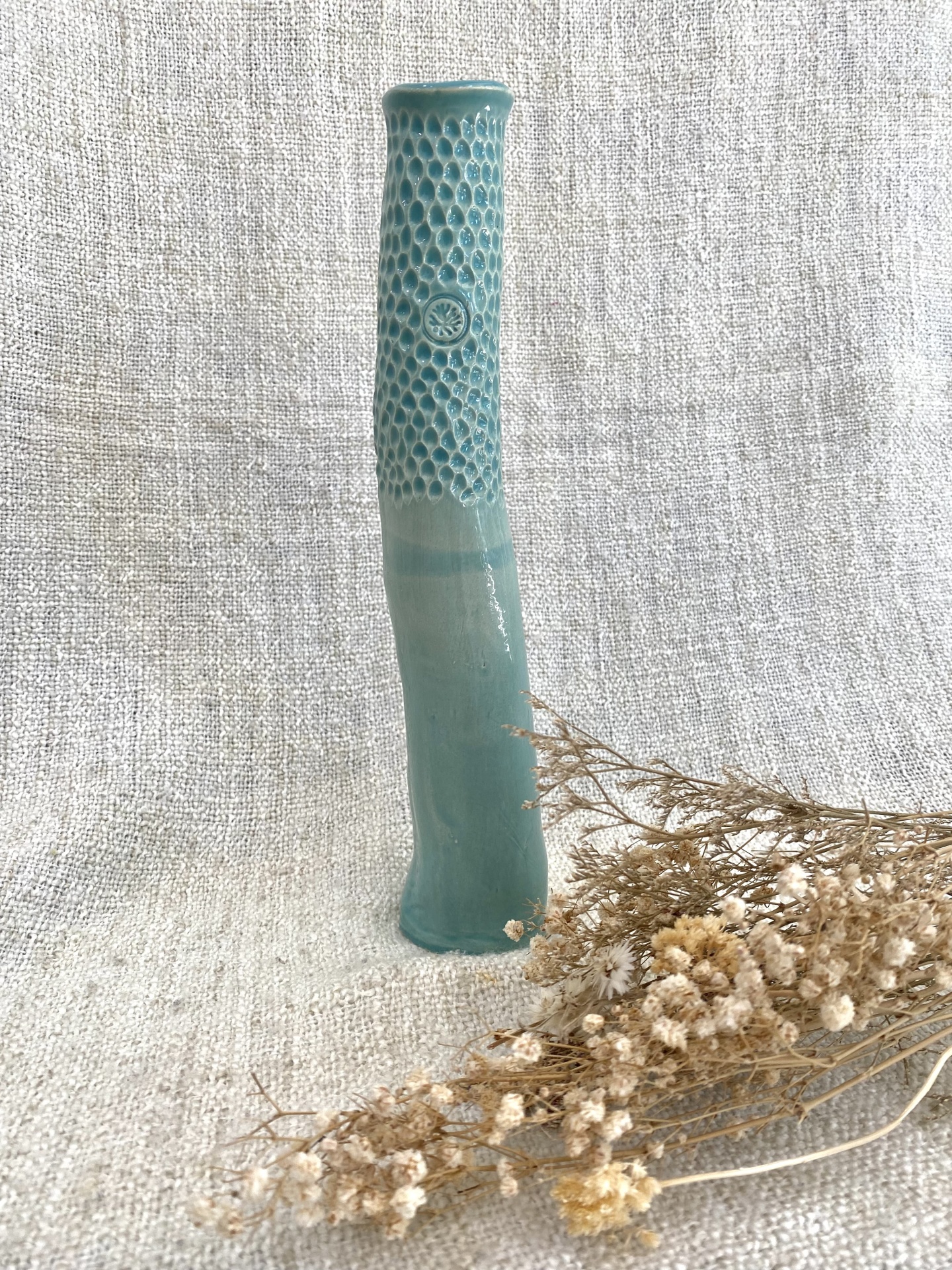 • Vaso cerâmico verde-azulado texturizado junto a flores secas sobre tecido cinza