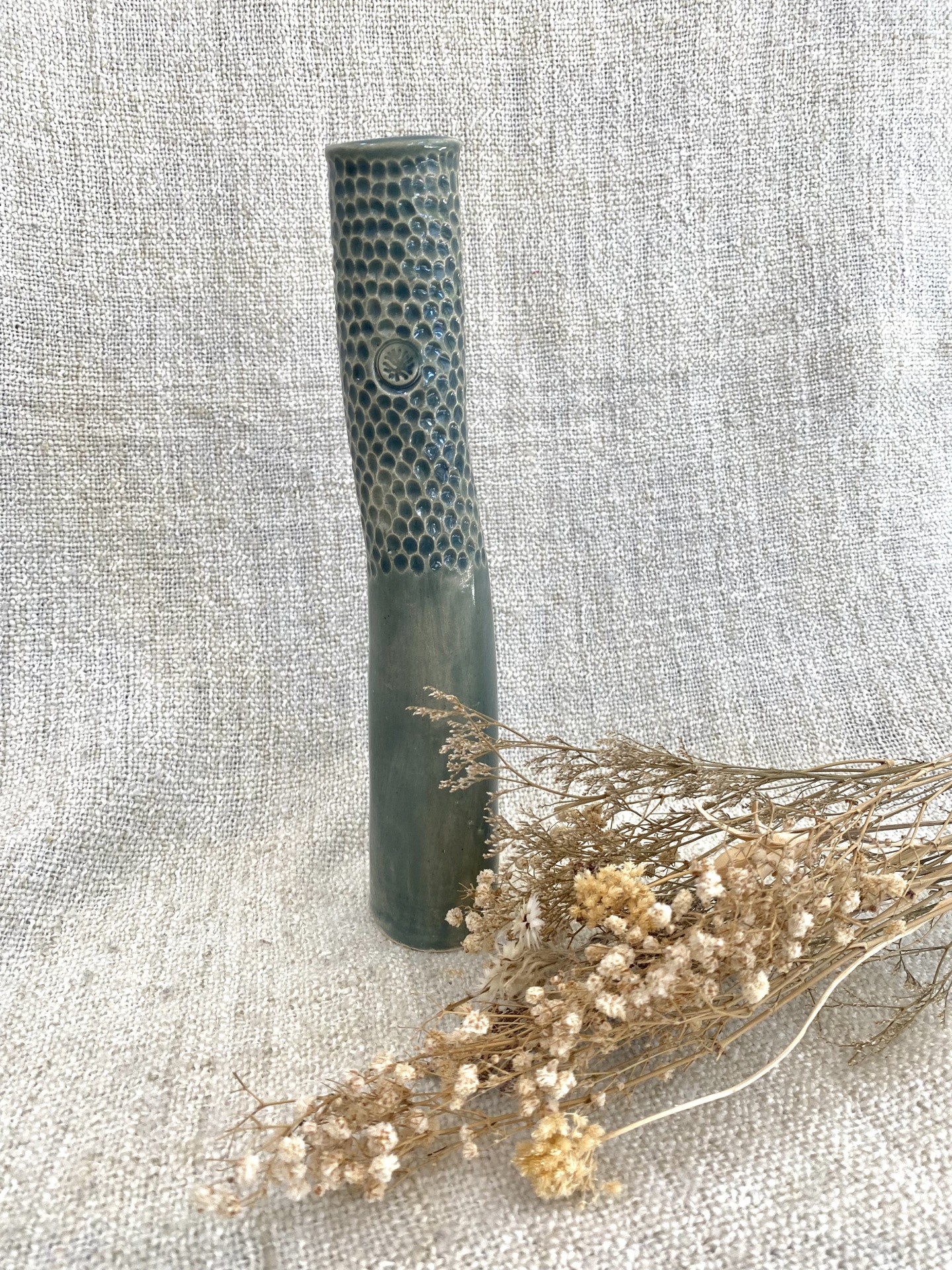 • Vaso cerâmico verde-azulado com textura em relevo e flores secas ao lado