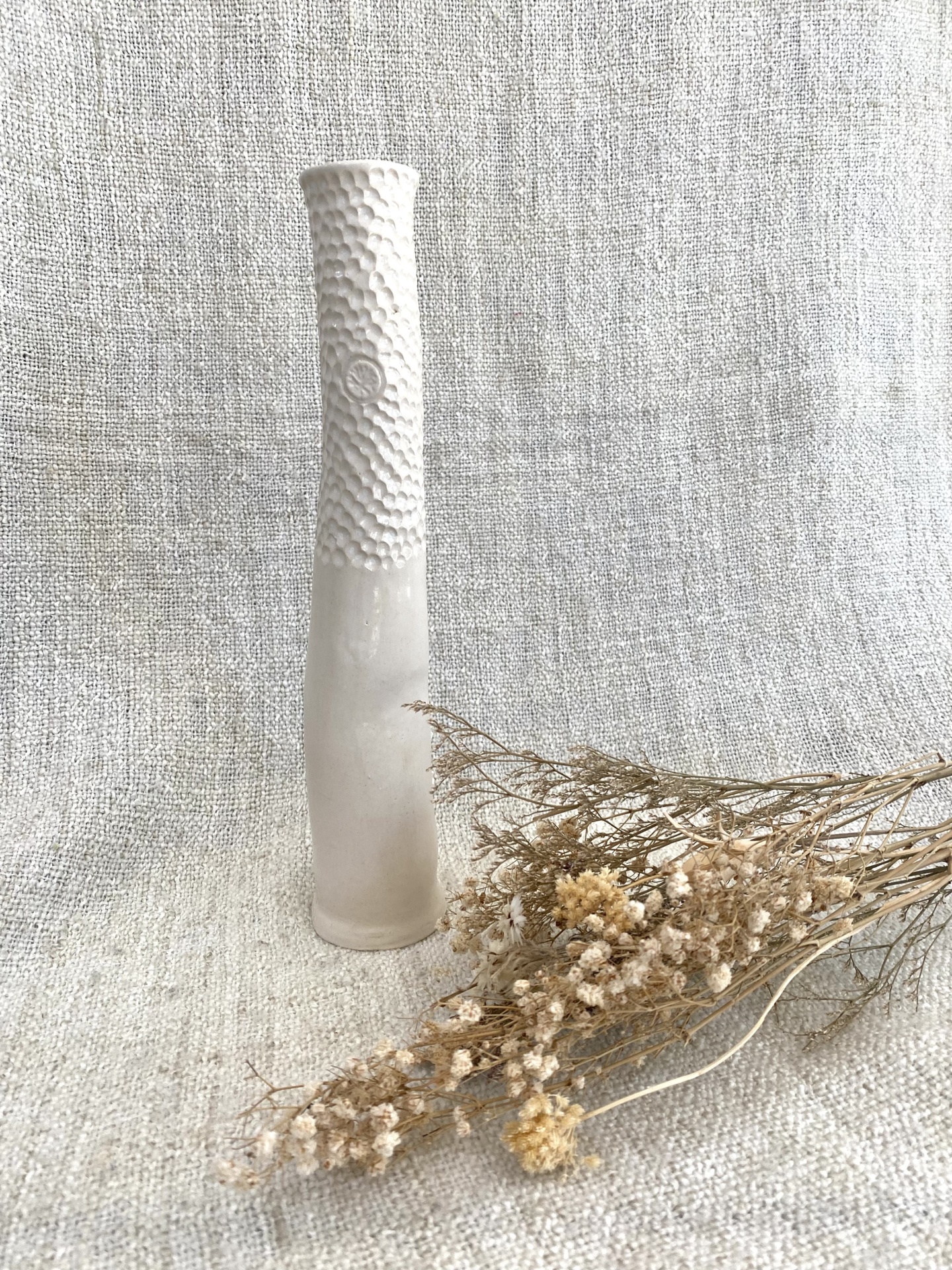 • Vaso branco texturizado com flores secas em fundo bege