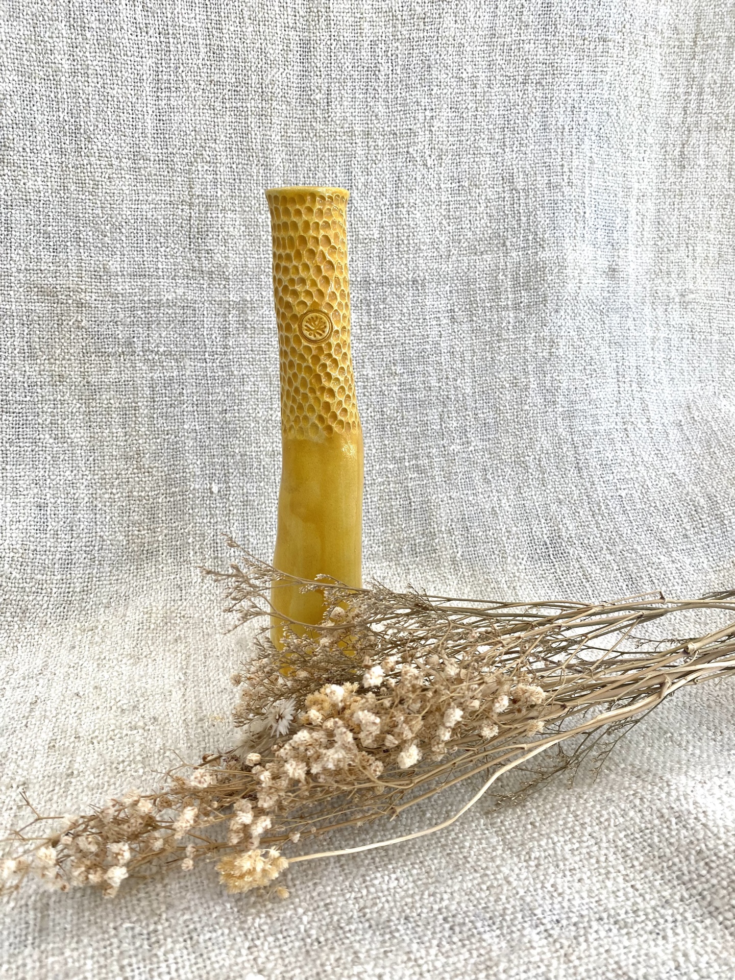 • vela artesanal amarela com textura de favo de mel e flores secas sobre tecido cinzento